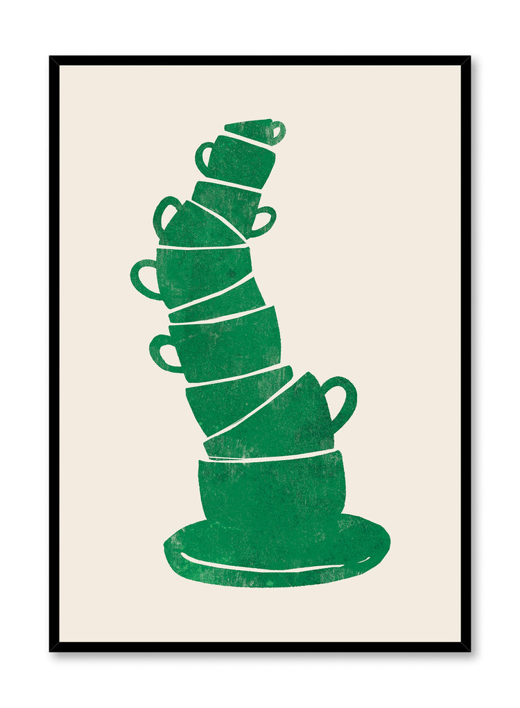 Cette œuvre d'art minimaliste capture un moment de chaos ludique avec une pile de tasses à café bancales et précaires. D'un vert vif et uniforme, les tasses oscillent les unes sur les autres, suggérant la satisfaction après un service de café chargé ou le prélude à un accident désastreux. Le design est simple, graphique et plein de mouvement implicite.