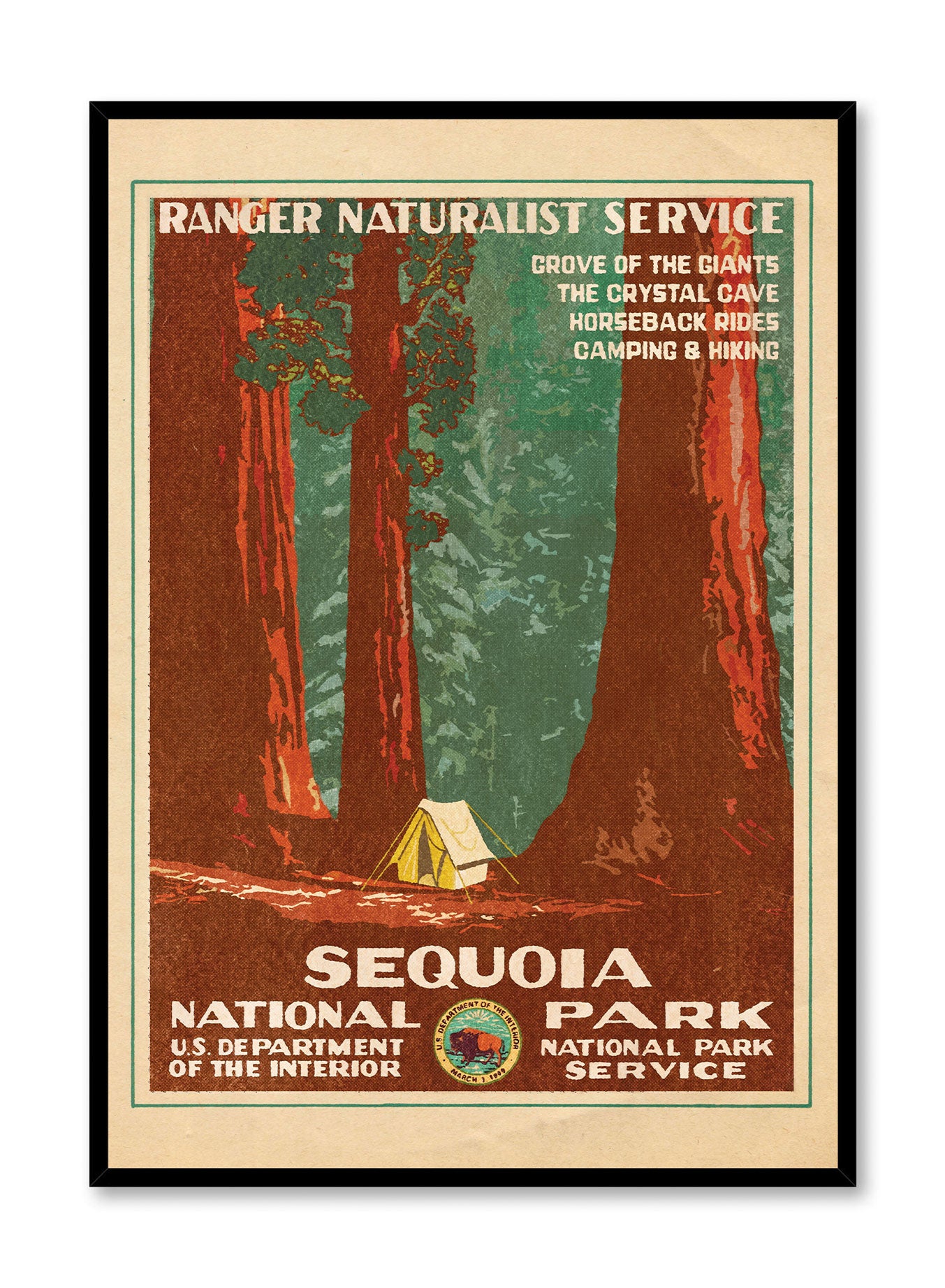 Célébrez la beauté de la nature avec cette reproduction artistique de style ancien du parc national de Sequoia. Avec ses séquoias imposants et son campement rustique, elle est parfaite pour ajouter une touche de grand air à votre intérieur.