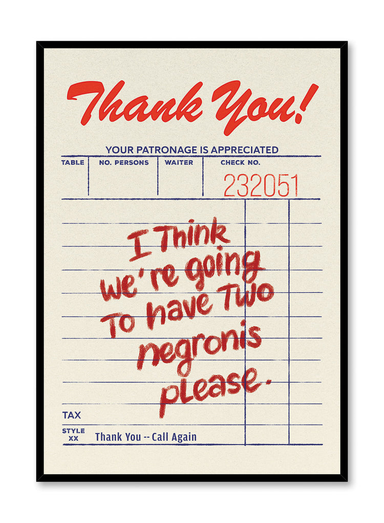 Cette œuvre d'art capture avec brio un moment de décision au restaurant, conçue pour ressembler à une addition classique. En haut, un joyeux « Merci ! » est imprimé en rouge, tandis qu'en dessous, une commande manuscrite dit : « Je pense que nous vous en prions ». Cette œuvre célèbre l'impatience du premier cocktail de la soirée.