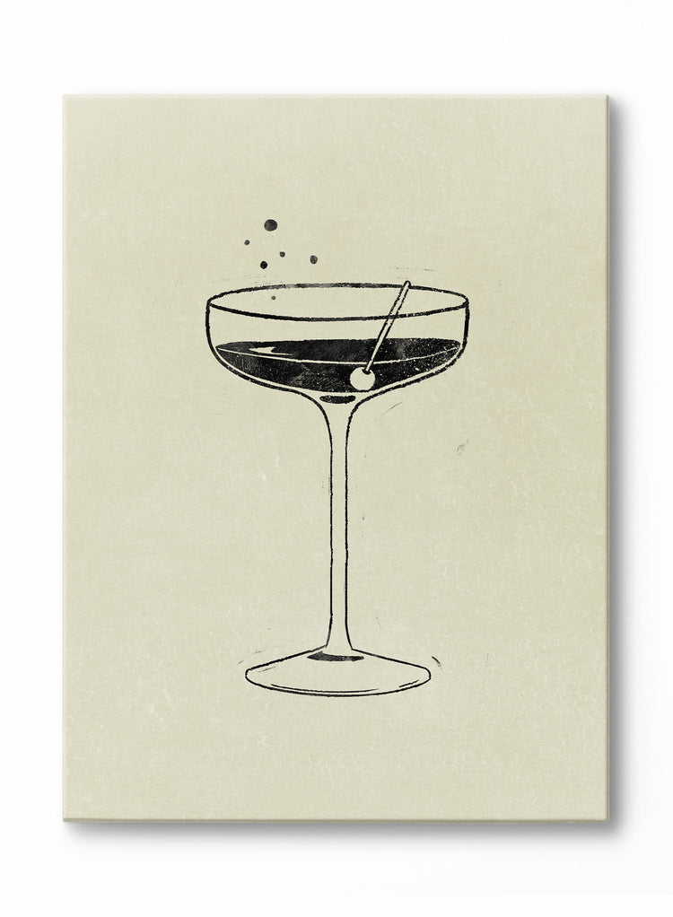 Cette toile minimaliste représente une élégante coupe, abritant des cocktails classiques, de l'Aviation au Gimlet. L'illustration simple et épurée représente un cocktail sombre, agrémenté de quelques bulles délicates et d'une petite garniture, capturant un moment de célébration paisible. Le motif, réalisé en une seule couleur, lui confère une touche graphique et sophistiquée.