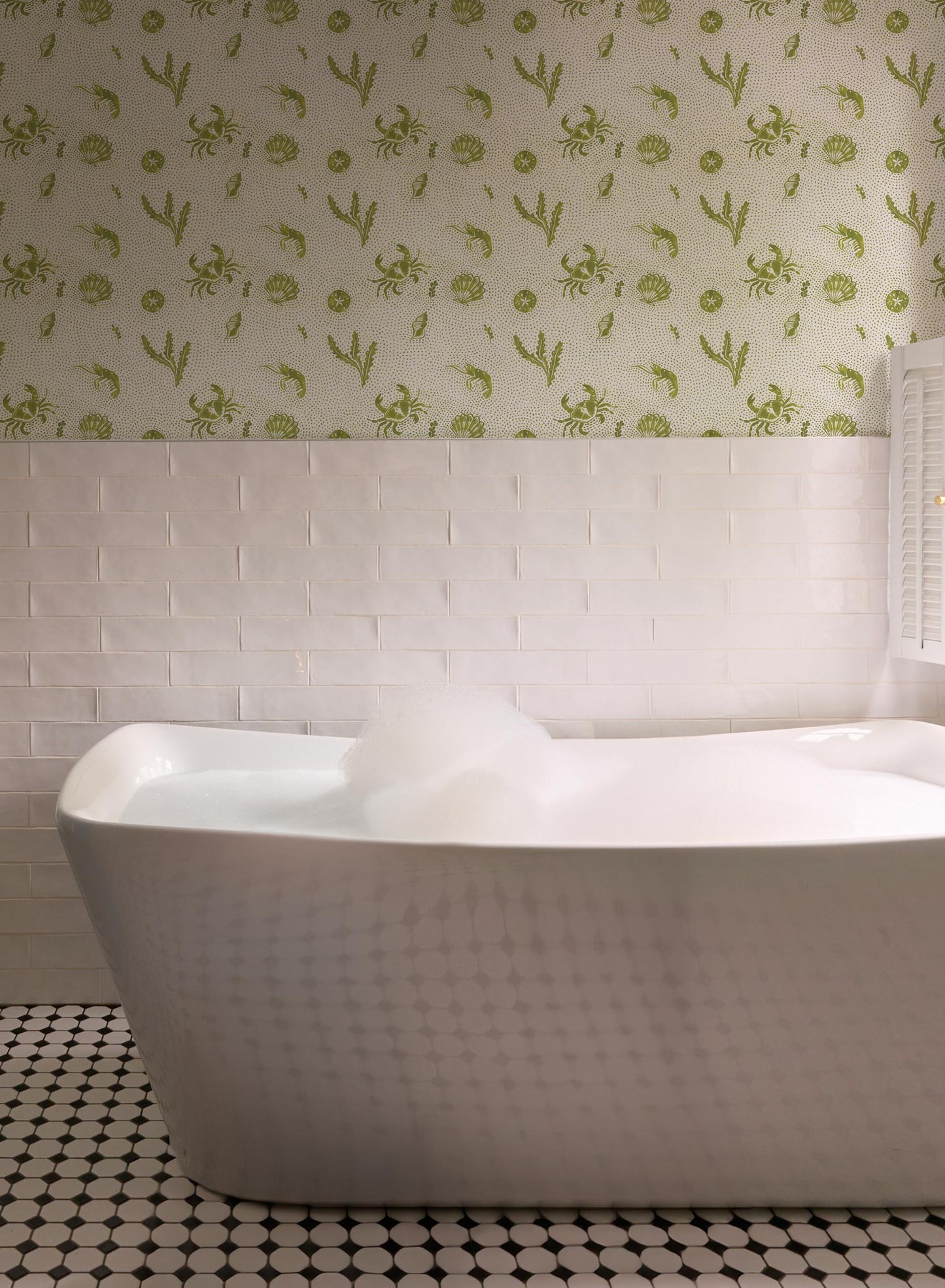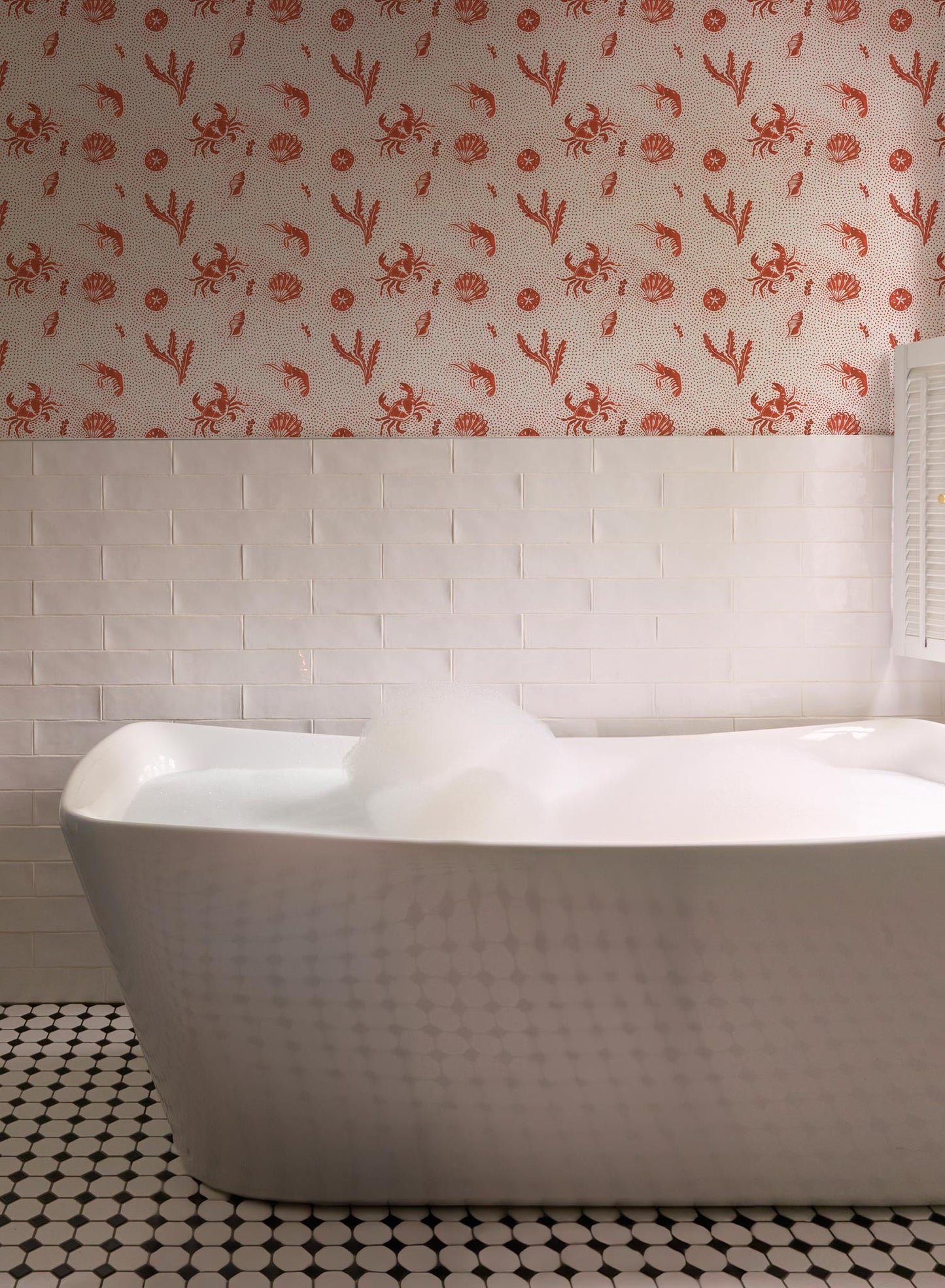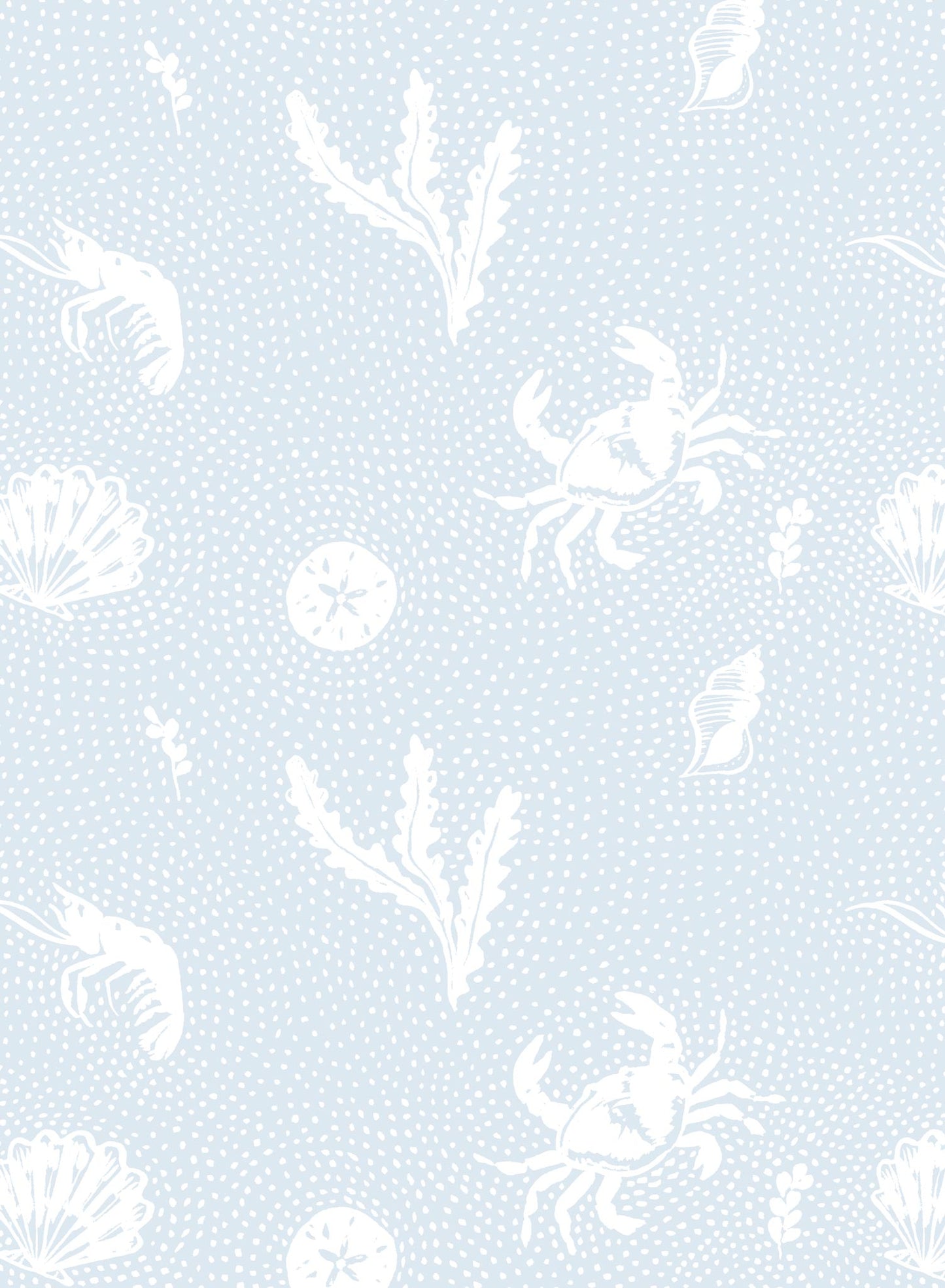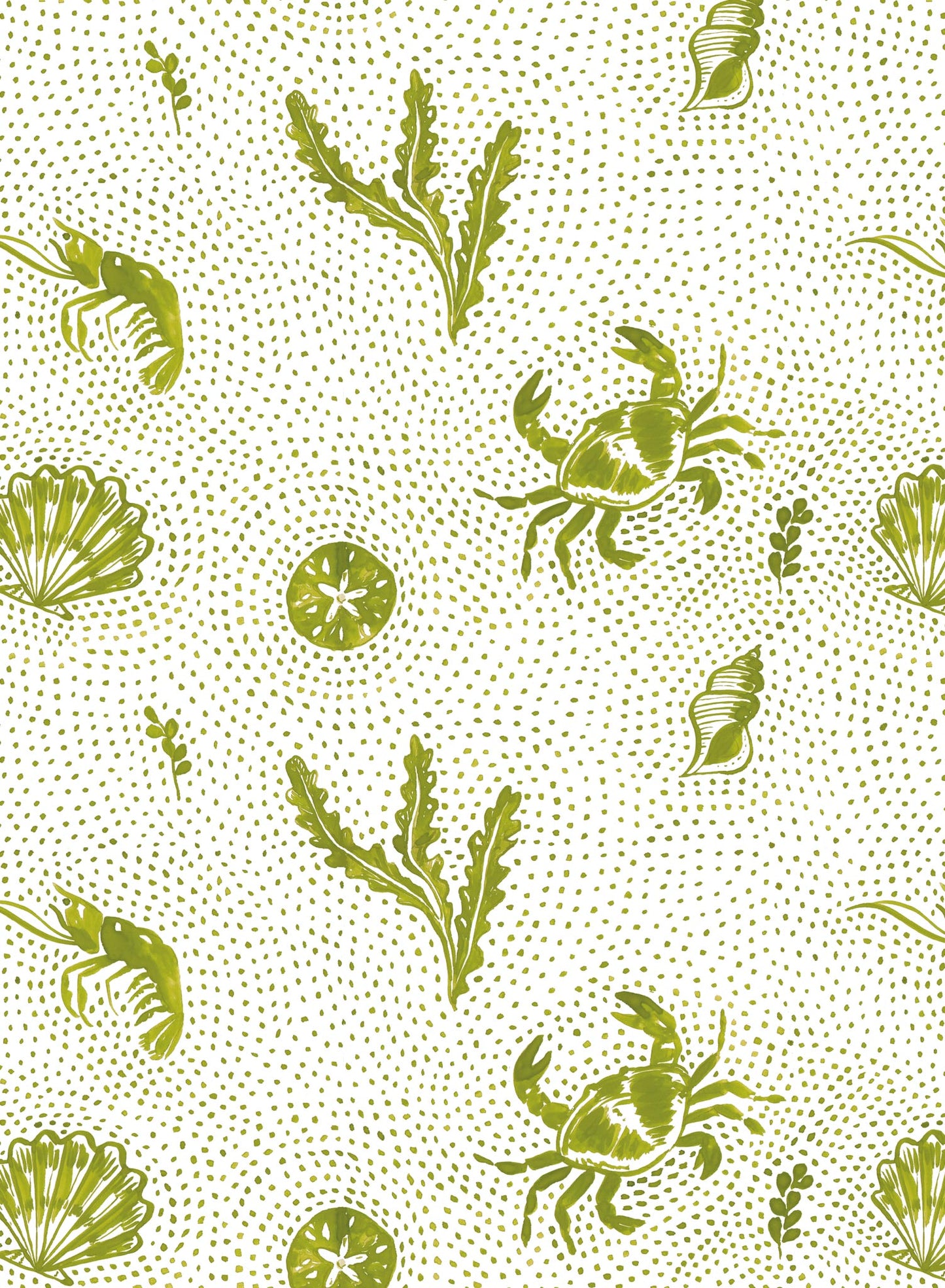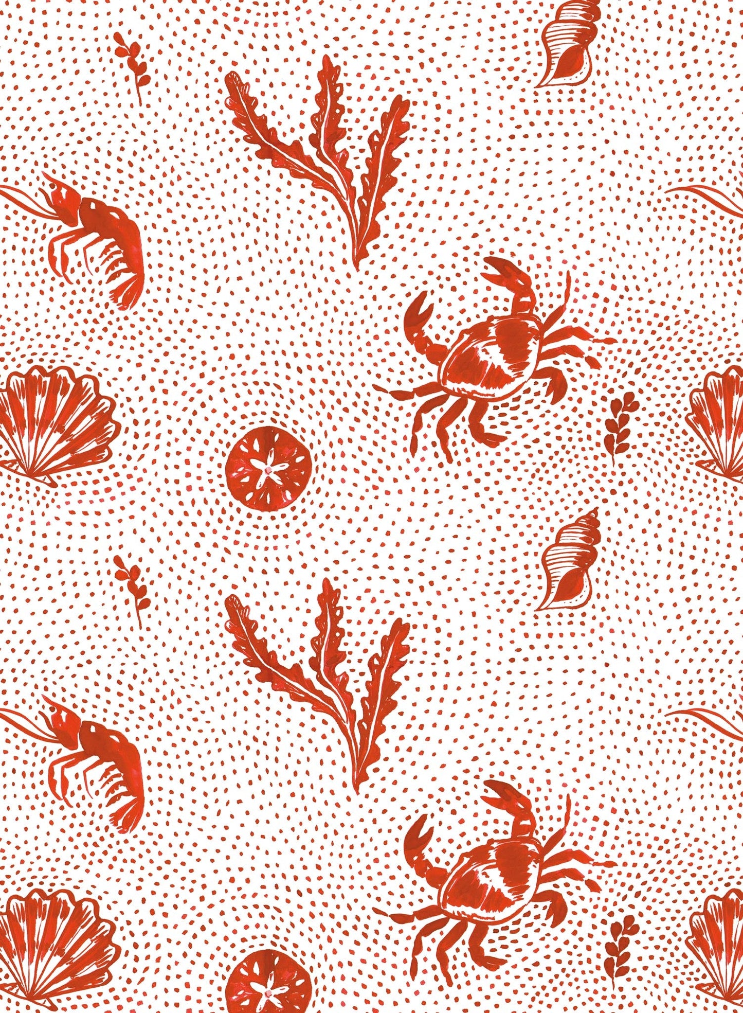 Il y a tout un monde sous les vagues. Ce papier peint comprend des crabes, des algues et des coquillages disposés sur une texture de sable finement pointillée.