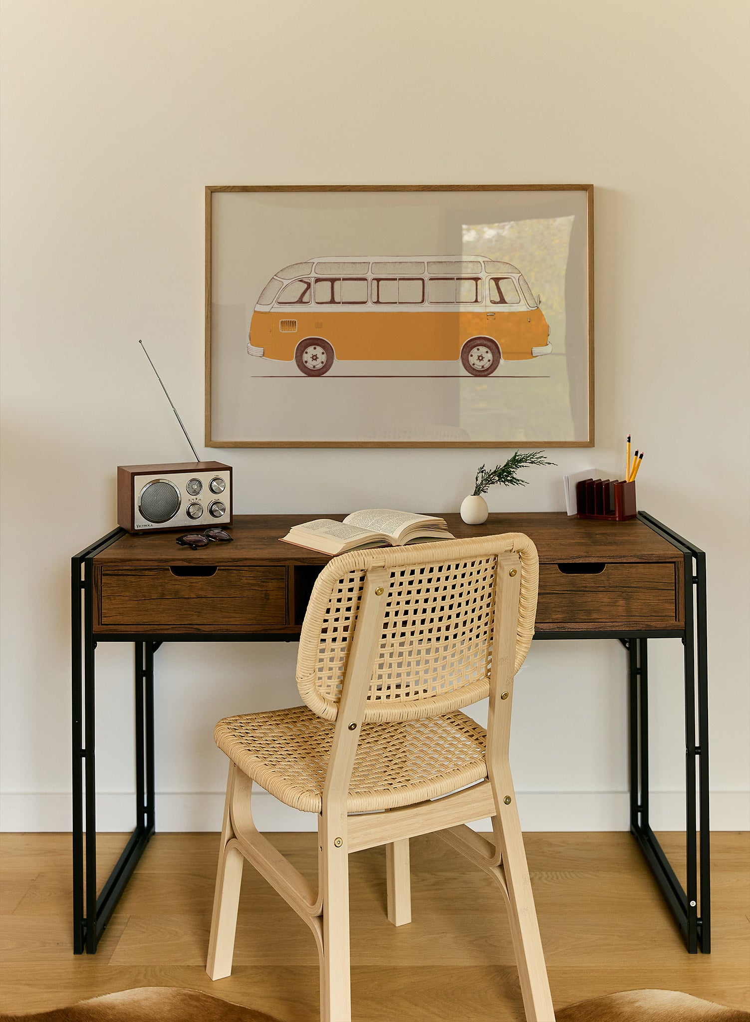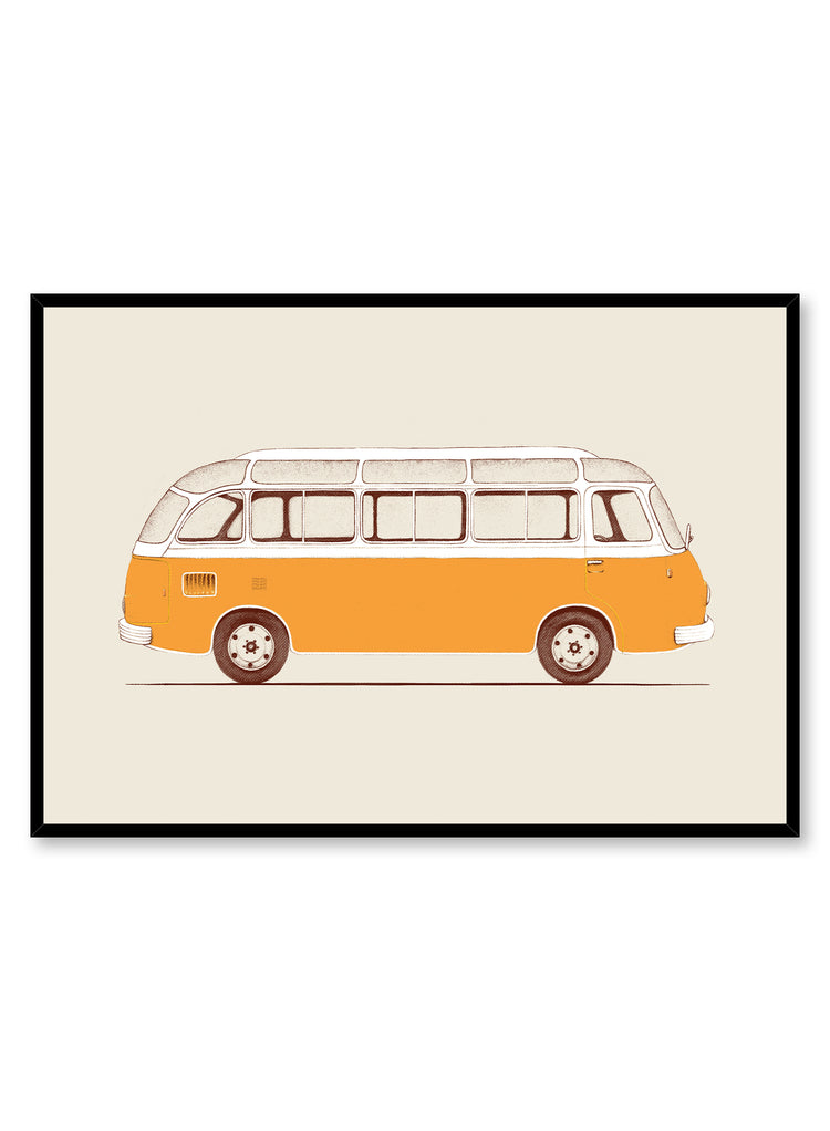 Illustré dans des tons gais de jaune et de blanc, ce affiche évoque un bus vintage avec une simplicité graphique épurée. Ses contours arrondis et ses détails minimalistes évoquent parfaitement les voyages nostalgiques et les aventures insouciantes.