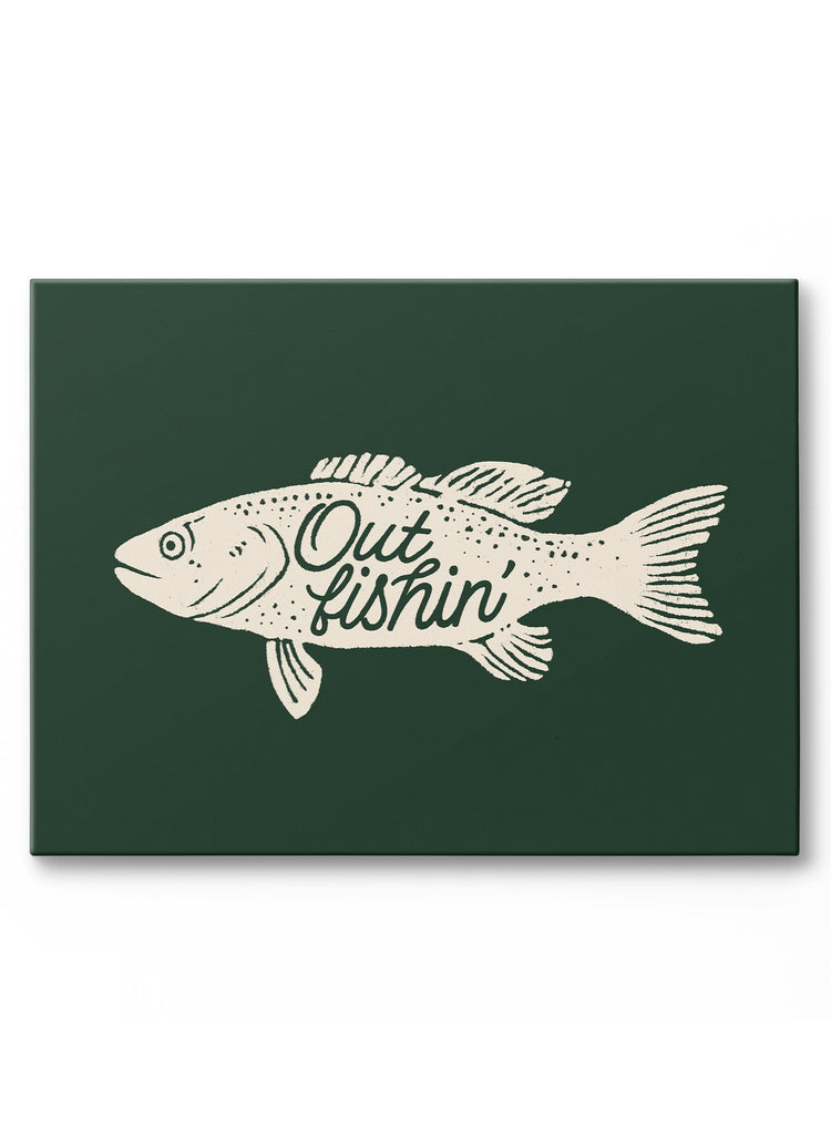 Mise en valeur d'une illustration de poisson minimaliste, avec l'inscription « Out Fishin» intelligemment intégrée à sa silhouette, cette toile présente des graphismes d'un blanc éclatant sur un fond vert forêt profond. Sa simplicité graphique et sobre séduit immédiatement.
