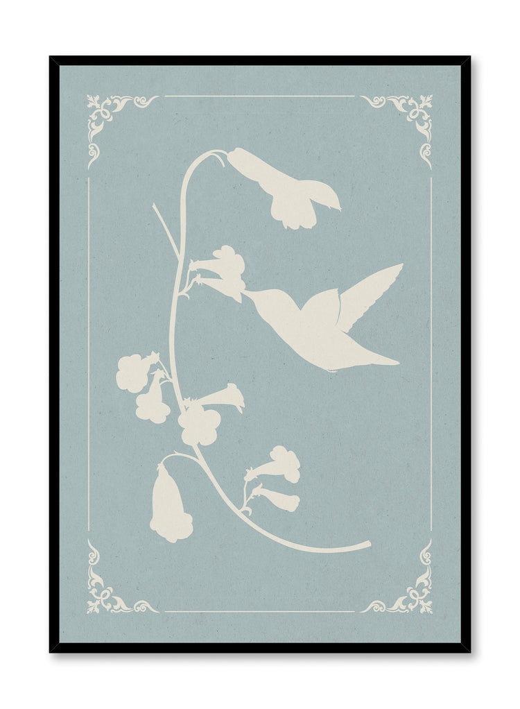Cette œuvre d'art en silhouette présente un colibri en plein vol, se nourrissant délicatement de fleurs en forme de clochettes. Les lignes épurées et le fond bleu poudre doux confèrent une ambiance vintage, tandis que le premier plan blanc crème ajoute du contraste et de l'élégance.