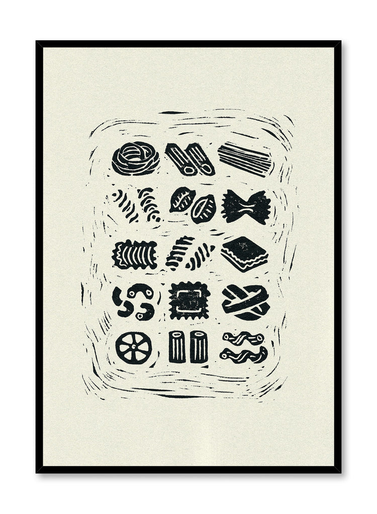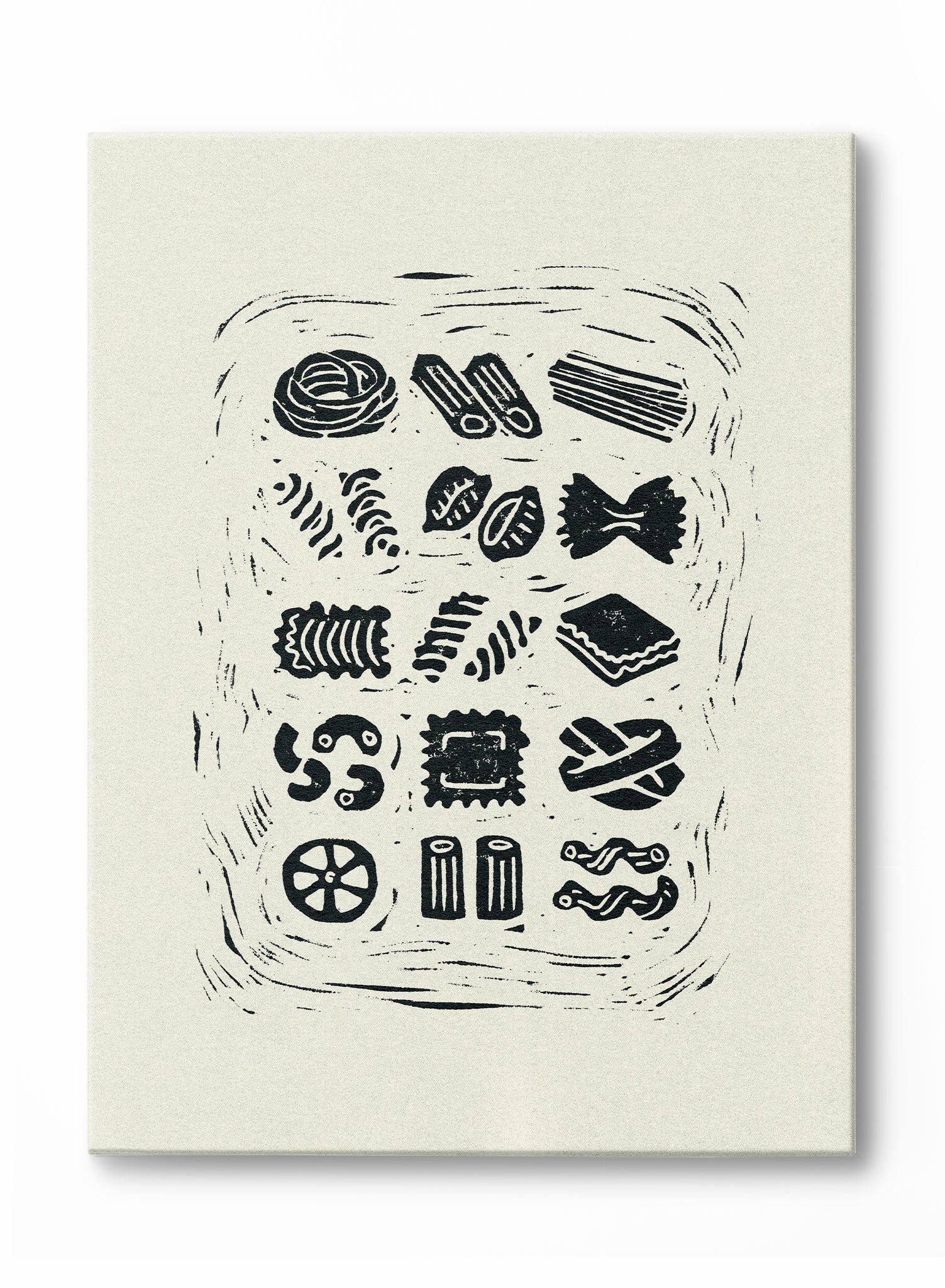 Cette saisissante linogravure affiche est une célébration graphique des pâtes sous toutes leurs formes. Une collection de seize formes différentes, des fettuccine et farfalle aux raviolis et rotelle, est disposée selon une grille soignée. Son design simple et monochrome et son esthétique sculptée à la main confèrent à la pièce un aspect rustique, artisanal et intemporel.