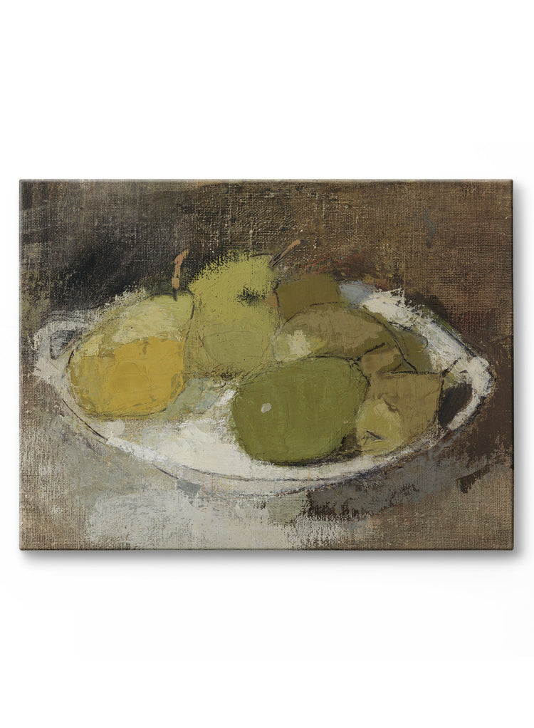 Cette représentation abstraite de poires dans un bol joue avec la texture et la couleur pour évoquer un sentiment de familiarité et de chaleur. Les verts et jaunes atténués des poires se détachent sur le fond rugueux et pictural, créant un contraste saisissant entre les fruits lisses et la surface texturée.