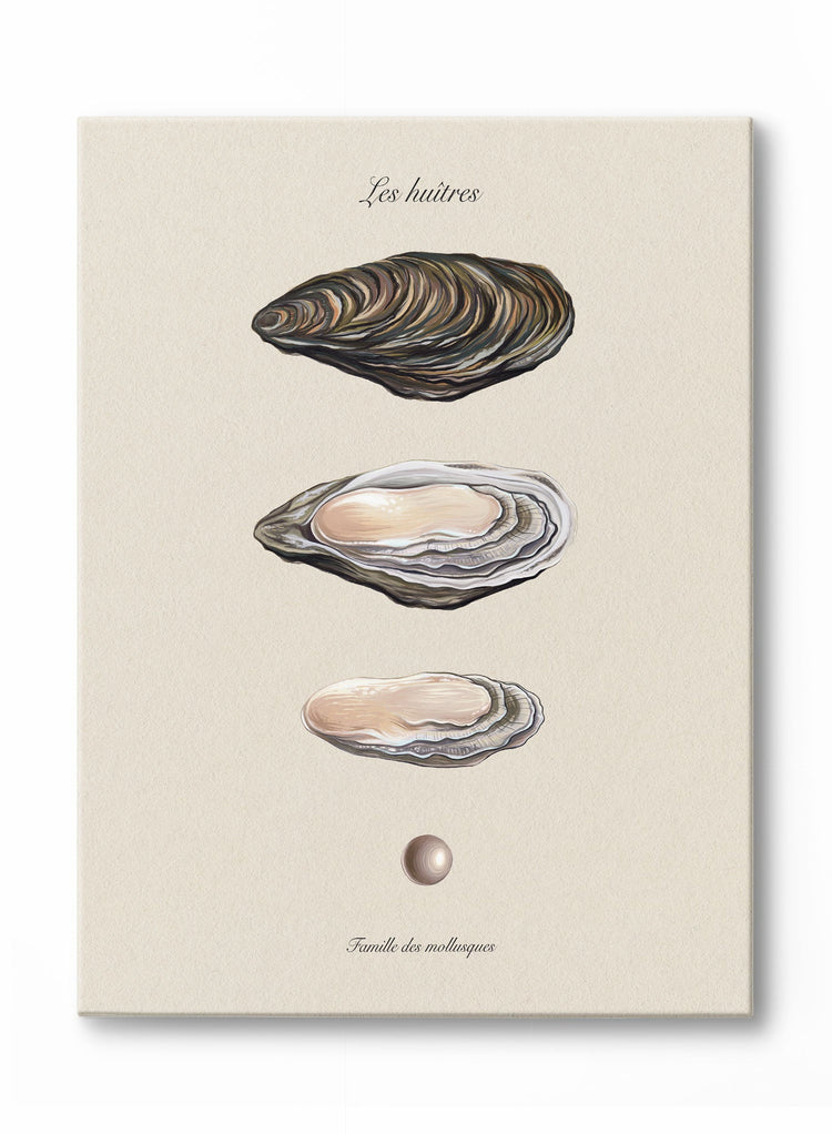 Les huîtres sont les joyaux de la mer ! Cette œuvre sur toile vintage le prouve en décrivant les différentes étapes qui mènent de la coquille d'huître non ouverte à la perle parfaite.
