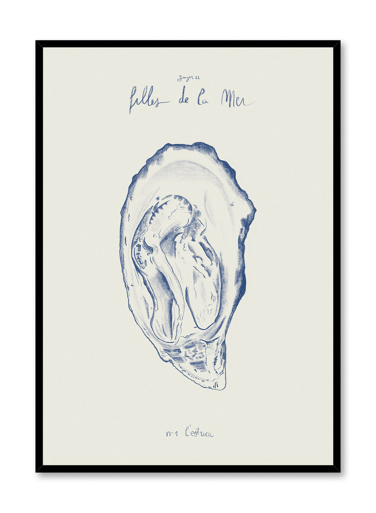 Rien de tel qu'un verre de vin blanc et des huîtres fraîches pour remonter le moral ! Cette illustration minimaliste bleu sur beige représente une coquille d'huître.