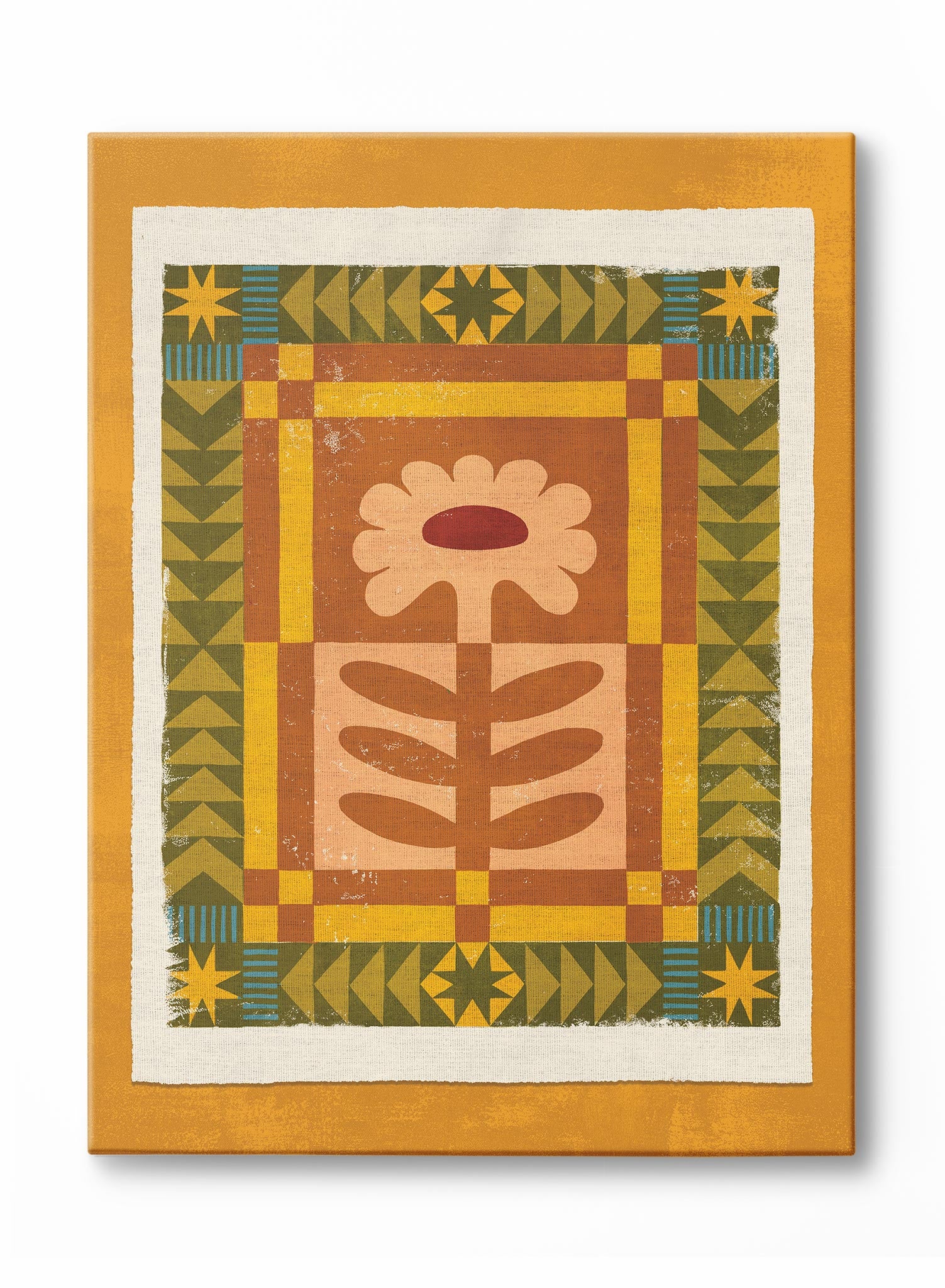 Ce affiche présente un motif floral stylisé et audacieux en son centre, encadré de motifs géométriques évoquant un savoir-faire artisanal. La fleur centrale, avec ses pétales et ses feuilles simples et arrondies, se détache sur un fond chaleureux et naturel, créant un point focal saisissant. Autour de la fleur, une série de bordures complexes aux couleurs contrastées ajoute de la profondeur et de l'intérêt, rappelant les motifs traditionnels des courtepointes.