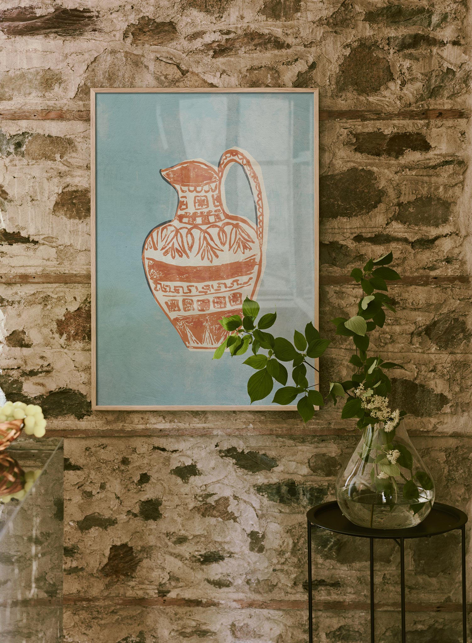 Cette œuvre d'art affiche représente une amphore magnifiquement stylisée, dont la forme puise ses racines dans l'Antiquité classique, mais est restituée avec une sensibilité fraîche et moderne. Le vase est décoré de délicats motifs botaniques et de motifs géométriques traditionnels, lui conférant un caractère rustique et artisanal. L'esthétique imprimée à la planche de l'illustration célèbre la beauté des objets artisanaux et le charme intemporel des traditions du design méditerranéen, ce qui en fait une pièce parfaite pour apporter une touche naturelle et sculpturale à un espace.