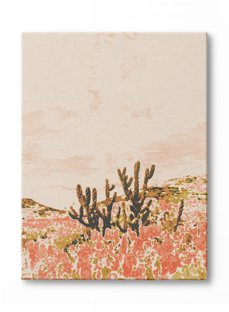 Ce champ de coquelicots est sûr d'infuser vos journées de couleur et de calme. Appréciez cette peinture bohème d'une prairie fleurie dans des tons de rose, de corail et de beige.