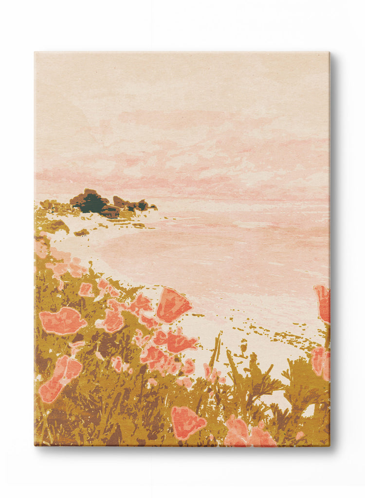 Vous pouvez toujours compter sur Falaise fleurie pour égayer vos journées ! Cette peinture de paysage bohème représente une falaise avec des fleurs roses surplombant l'océan.