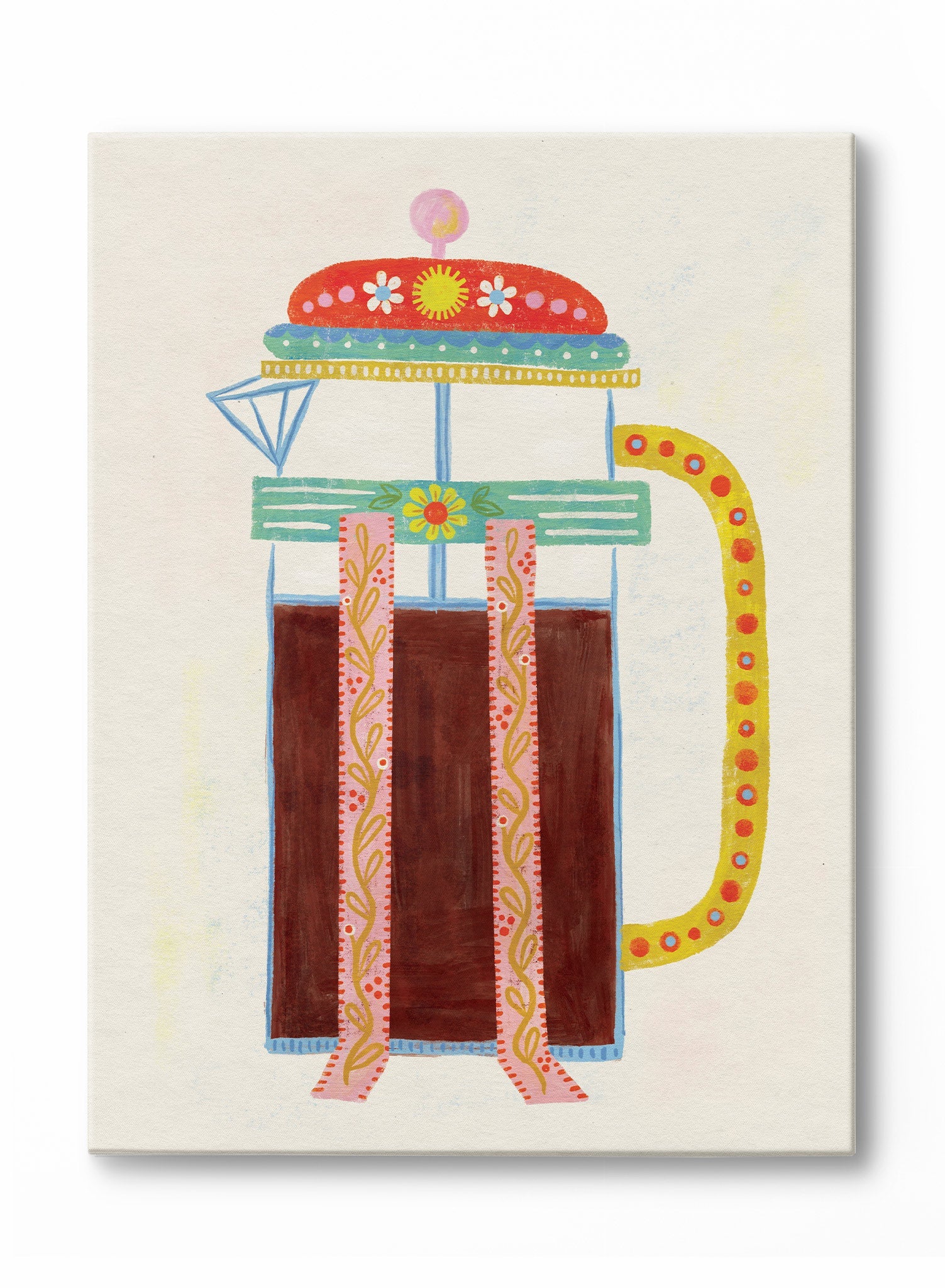 La joie maximaliste caractéristique de Kenzie Elston brille dans ce gros plan d'une presse française fantaisiste, décorée de bordures ornées et surmontée d'un couvercle rouge cerise qui semble presque festif. Chaque détail, du bouton floral à la poignée à motifs, semble judicieusement placé.