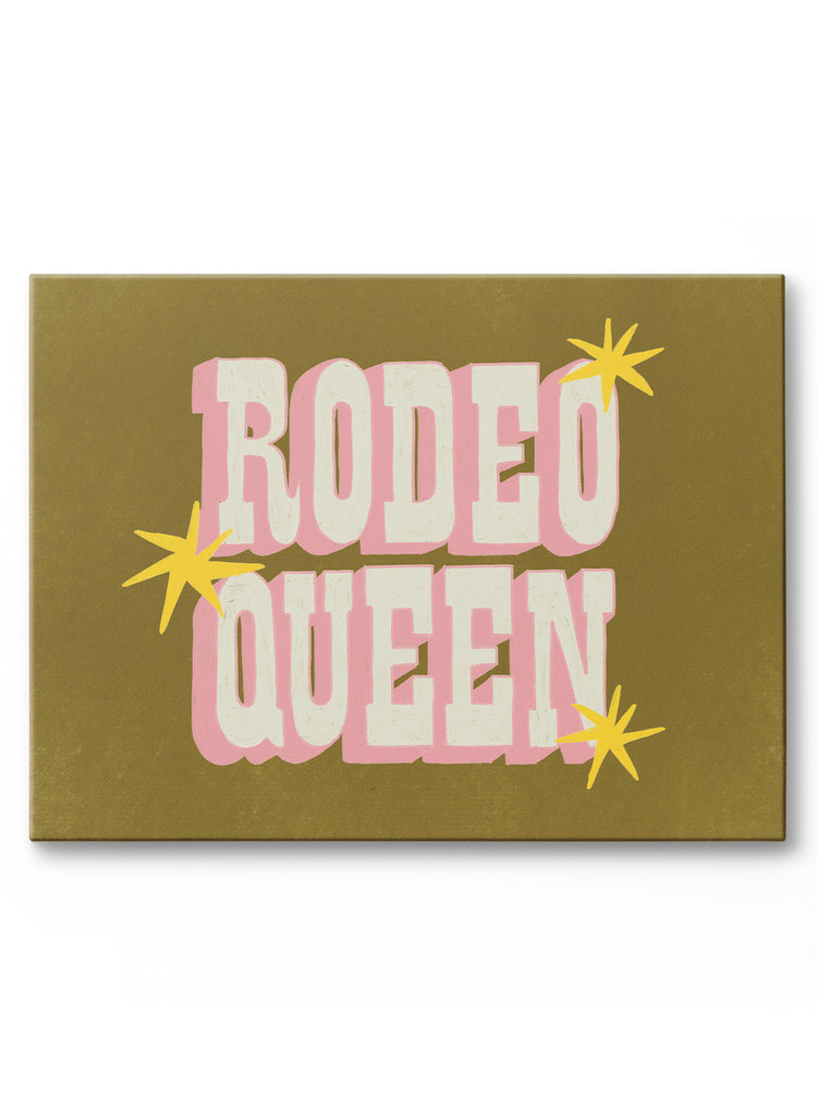 Célébrez la culture occidentale avec cette œuvre sur toile "Rodeo Queen". Avec son texte rose et blanc et ses étoiles jaunes sur fond vert olive, elle est parfaite pour ajouter une touche rustique et amusante à n'importe quelle pièce.