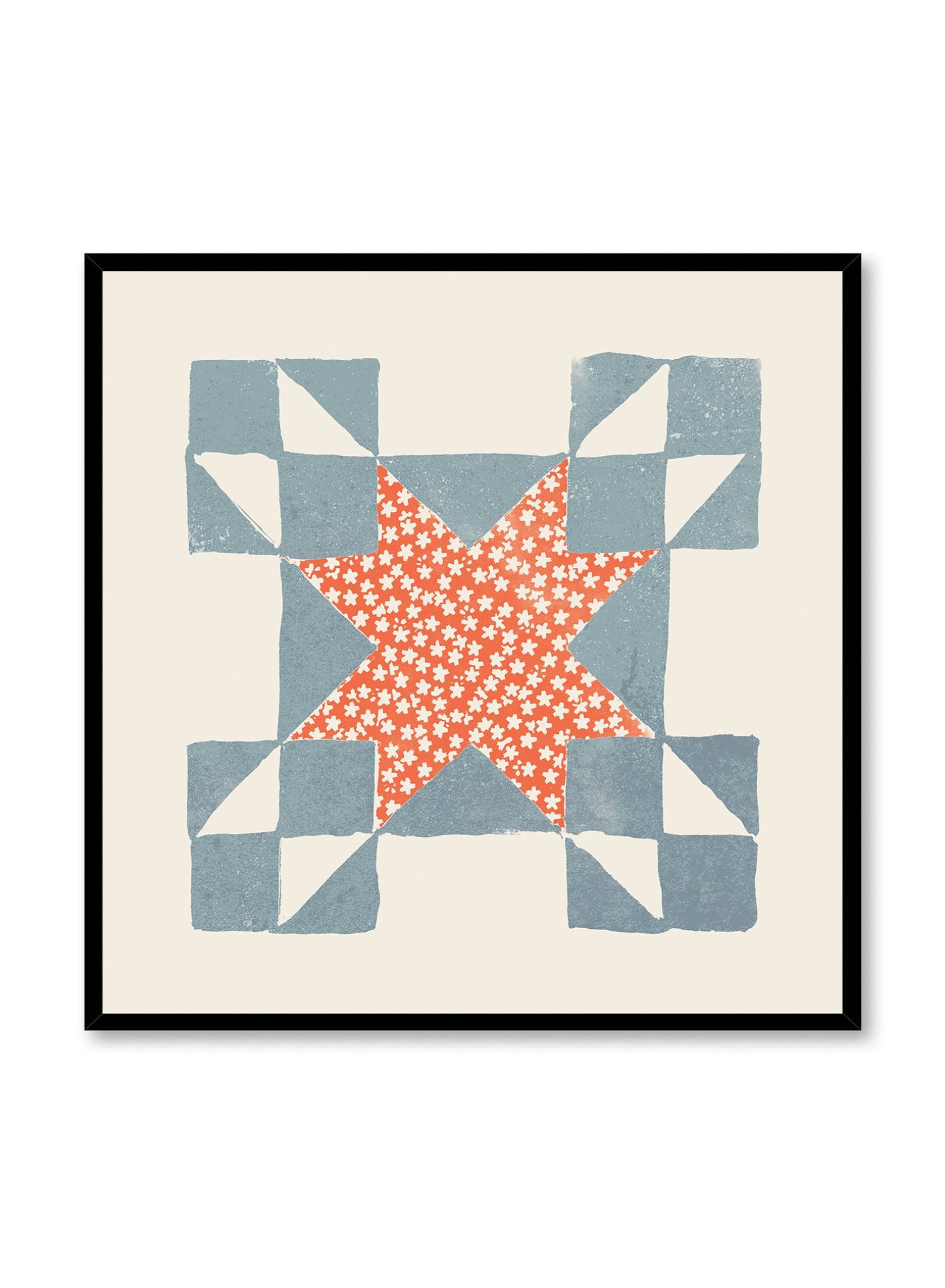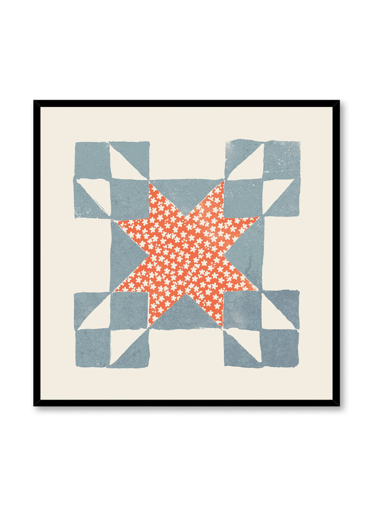 Cette pièce présente un motif géométrique saisissant, où une étoile rouge centrale, ornée de petites fleurs blanches, attire le regard. Autour de l'étoile, une série de triangles bleus et blancs crée une bordure dynamique, ajoutant de la profondeur et du contraste à la composition. Le fond crème doux met en valeur les couleurs vives.