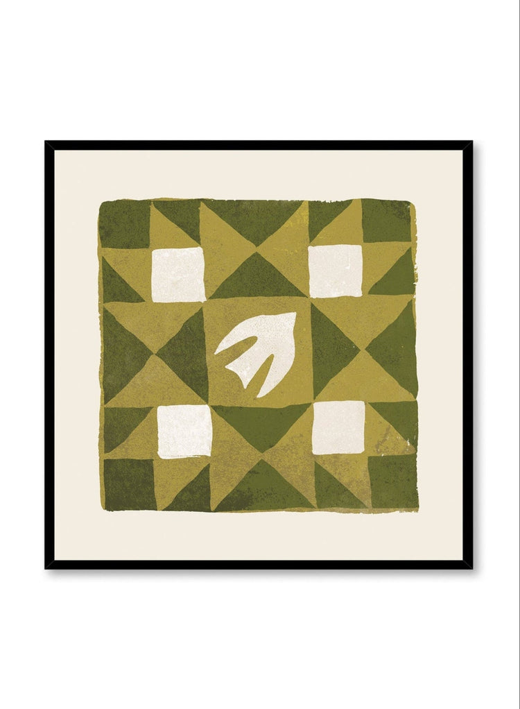 Cette affiche présente une composition géométrique mettant en scène un motif central représentant une main blanche, entouré d’une mosaïque de triangles et de carrés vert olive et vert mousse. Le motif se détache sur un fond crème doux, créant un contraste saisissant qui attire le regard sur la finesse des formes et des motifs.