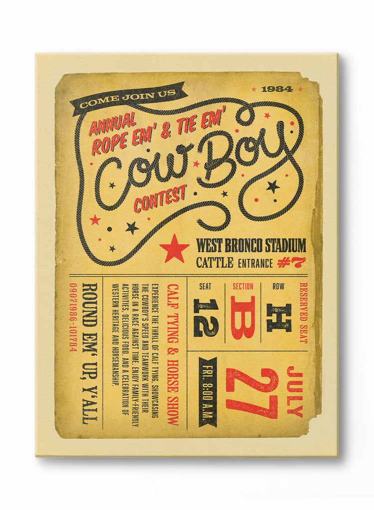 Infusez dans votre décor un charme western vintage grâce à cette œuvre sur toile représentant un concours de cow-boys classique. Le dessin comprend une typographie audacieuse et des rouges et jaunes vibrants, évoquant l'excitation d'un événement de rodéo en 1984. Parfait pour ajouter une touche de nostalgie américaine à n'importe quelle pièce.