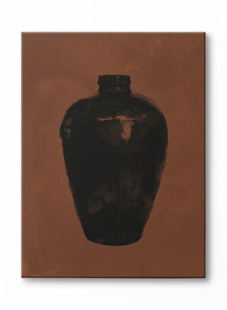 Cette œuvre sur toile minimaliste représente un simple vase noir sur un fond brun foncé.
