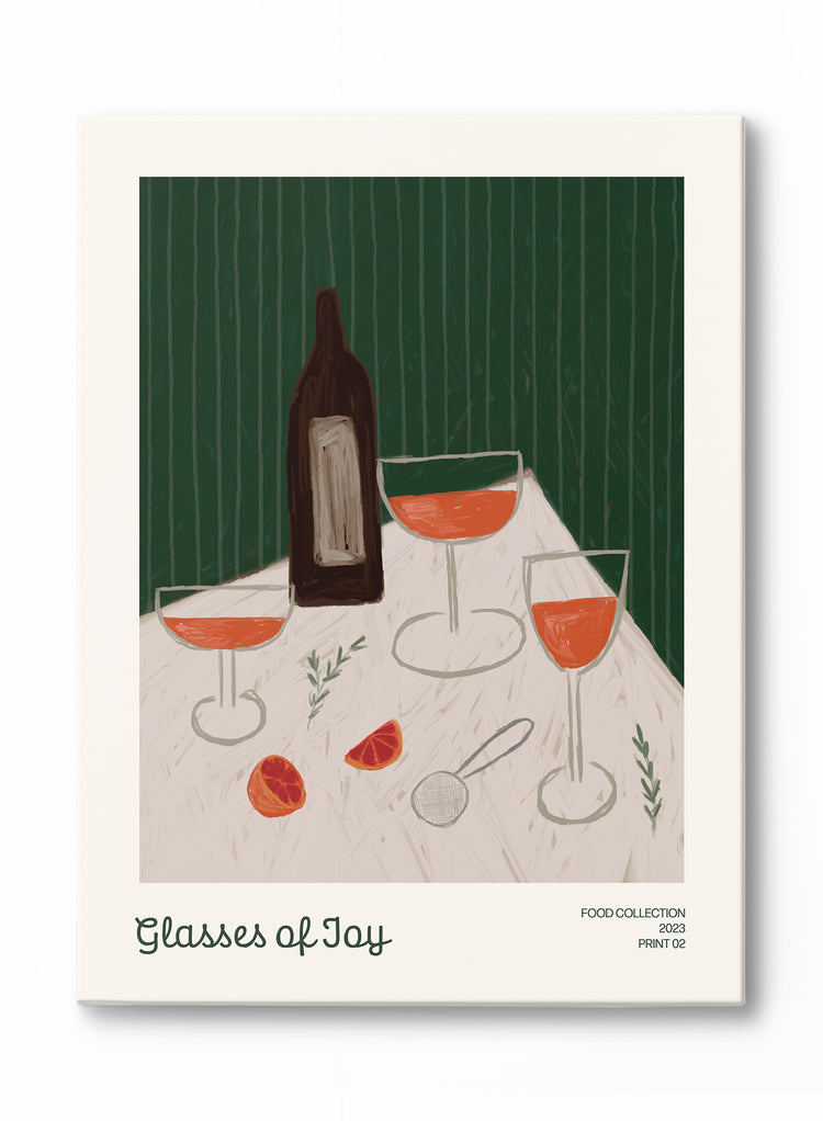 "Romarin et rosé" ? Pour nous, c'est la soirée parfaite ! Savourez cette œuvre sur toile colorée de verres de vin rosé et de feuilles de romarin posés sur une table blanche devant un mur rayé vert émeraude.