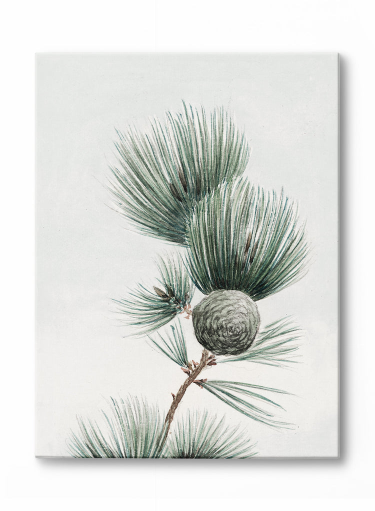 Téléportez-vous dans une forêt paisible avec l'œuvre sur toile "Saison Sereine". Cette œuvre sur toile botanique sur le thème de l'hiver présente des feuilles persistantes et une pomme de pin sur une branche de pin.