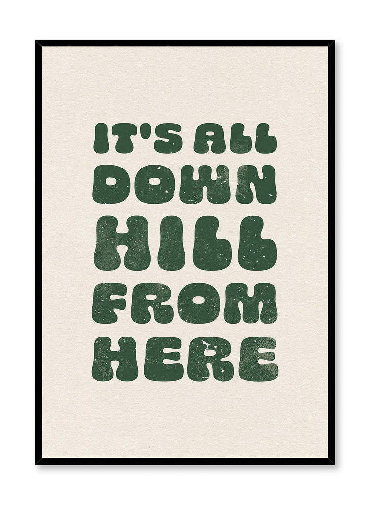 Si vous avez des skis et de l'optimisme, l'expression "It's all down hill from here" vous fera certainement sourire. Cette affiche typographique amusante présente un jeu de mots inspiré du ski ou du snowboard en lettres vertes grasses sur un fond beige.