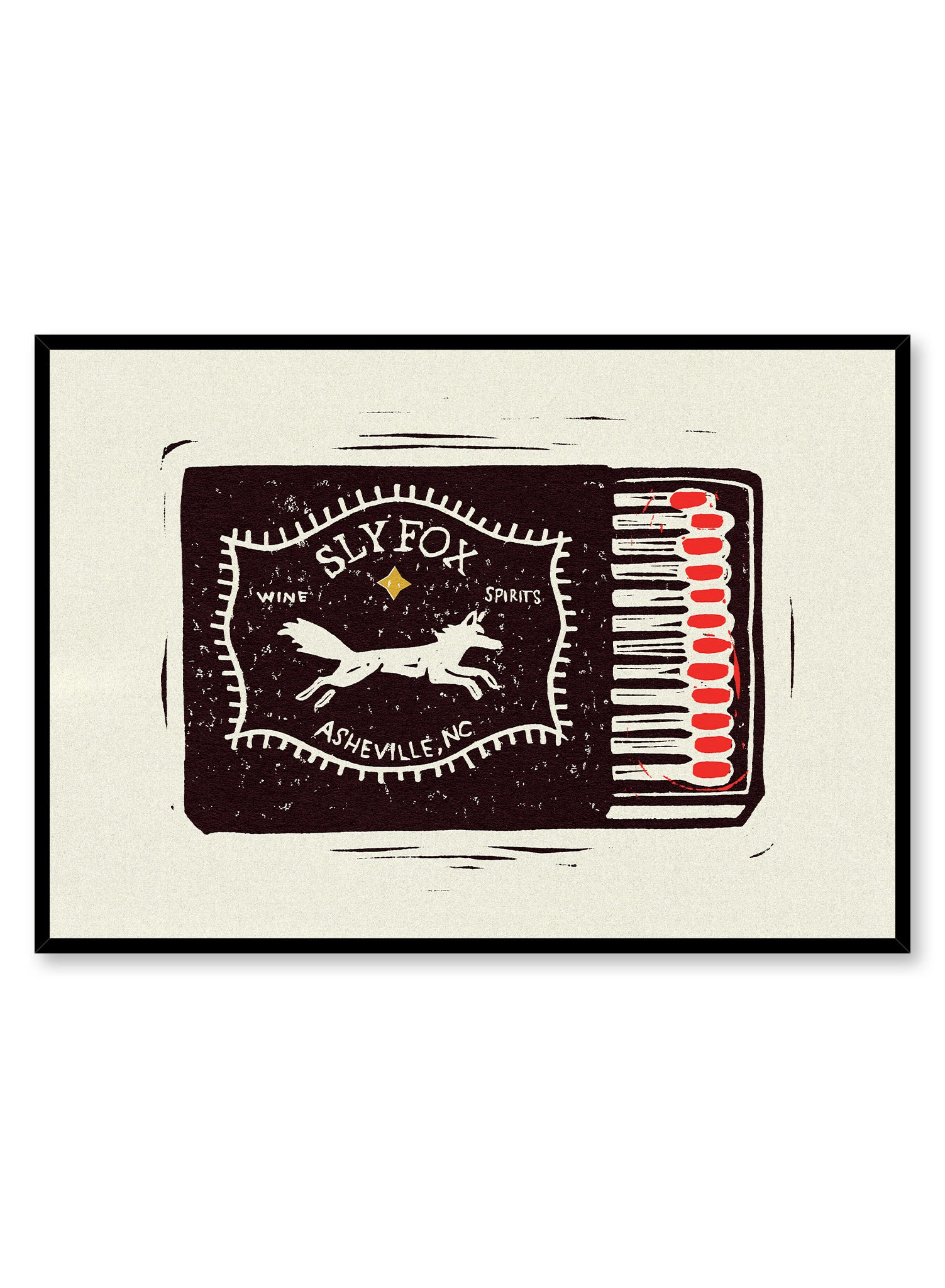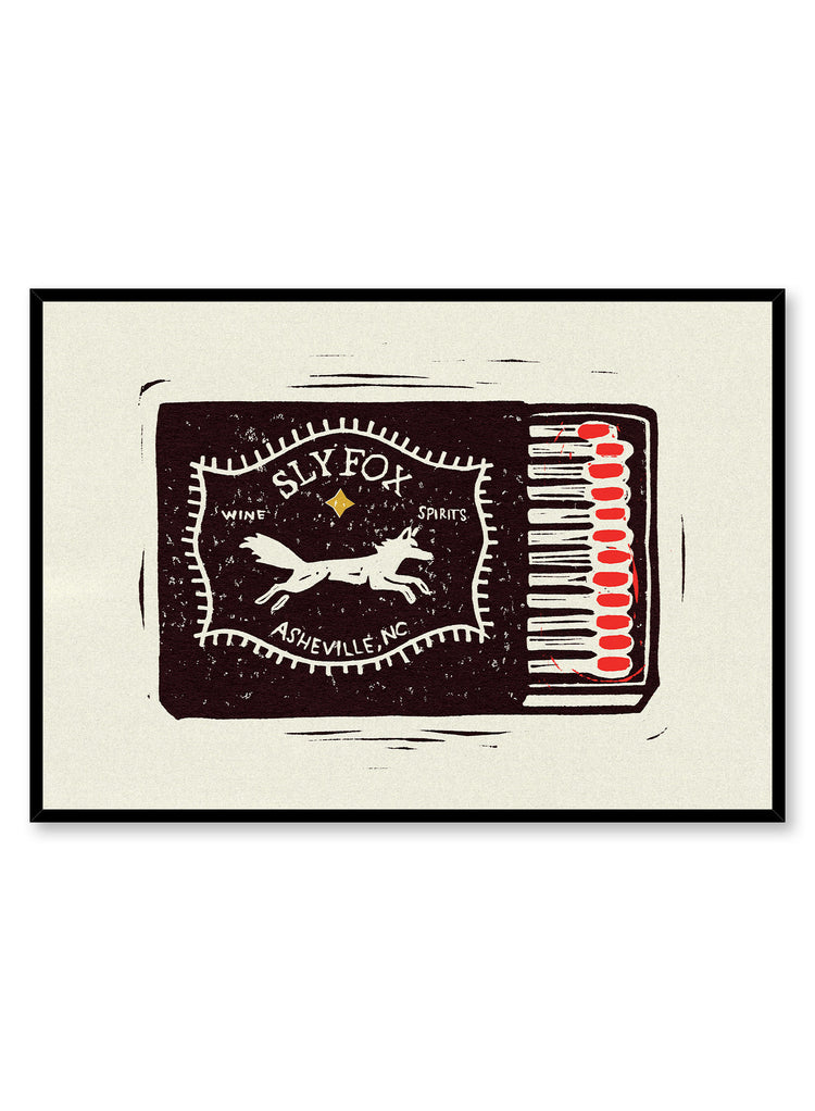 Cette affiche présente une illustration graphique d'une pochette d'allumettes vintage provenant du bar « Sly Fox » d'Asheville, en Caroline du Nord. Réalisé dans un style linogravure audacieux, le motif comprend un renard bondissant et une typographie classique, avec une rangée d'allumettes à pointe rouge soigneusement exposée. C'est un clin d'œil ludique aux objets éphémères des restaurants et à la qualité tactile d'un précieux souvenir de votre lieu de prédilection.