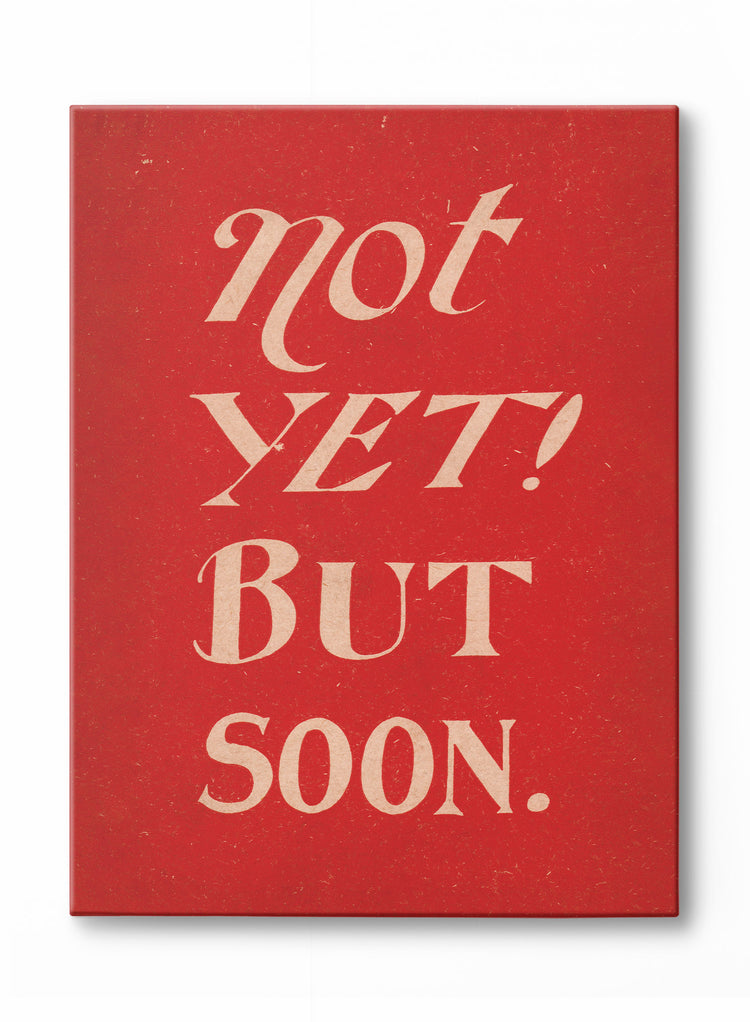 Cette œuvre sur toile typographique présente la phrase audacieuse « Pas encore! Mais bientôt. » dans une police à empattement vintage, sur un fond rouge texturé.