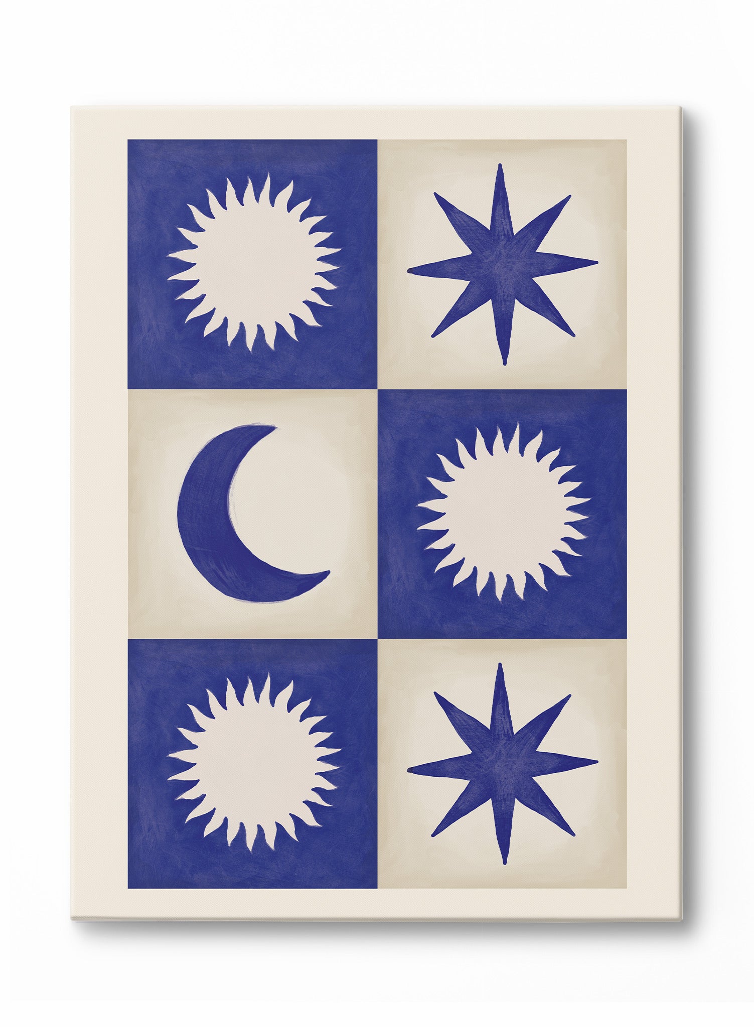 Ce affiche graphique et audacieux présente un agréable damier d'icônes célestes, apportant une touche de fantaisie cosmique à tout espace. Des soleils stylisés, aux pointes nettes et rayonnantes, alternent avec un croissant de lune serein et des étoiles simples et élégantes. Le design est à la fois ancien et moderne, rappelant l'impression traditionnelle au tampon, le carrelage ou l'art populaire d'une région méditerranéenne baignée de soleil.