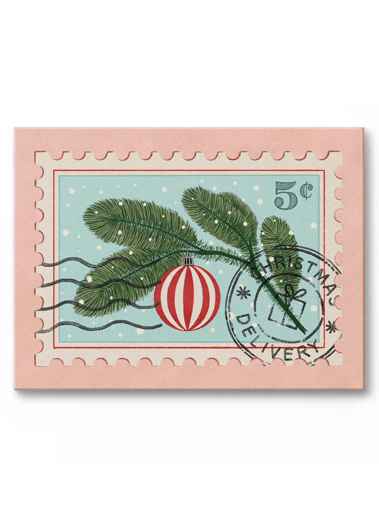 Cette œuvre sur toile représente un timbre-poste de style vintage avec une branche d'un arbre de Noël, ornée d'une décoration rouge classique. Les délicates aiguilles de la branche sont soigneusement détaillées, tandis que l'ornement rouge audacieux ajoute une touche de couleur sur le doux fond bleu. Le motif du timbre, accompagné d'un cachet postal festif, évoque les souvenirs de la réception des cartes de vœux par la poste.