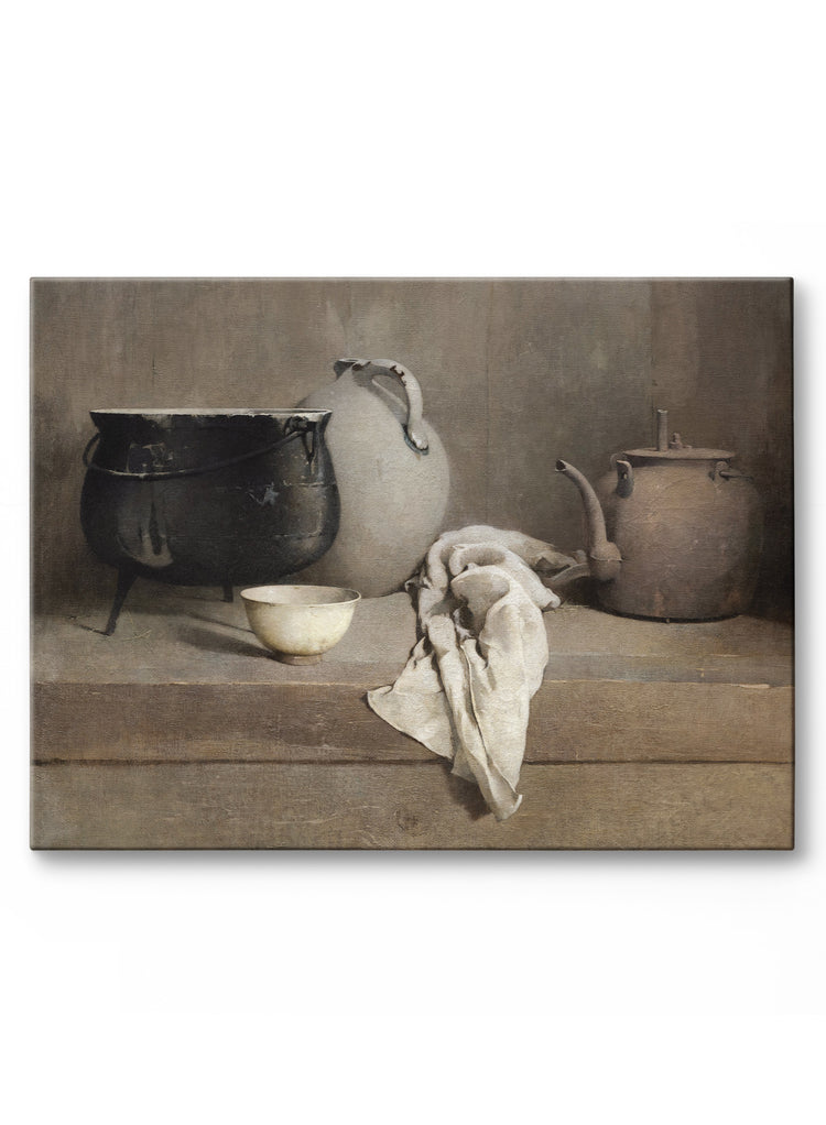 La peinture ‘L’étude en gris’ d'Emil Carlsen est une nature morte composée d'objets quotidiens tels qu'une bouilloire, un chaudron, une serviette et un vase, tous dans différentes nuances de gris.
