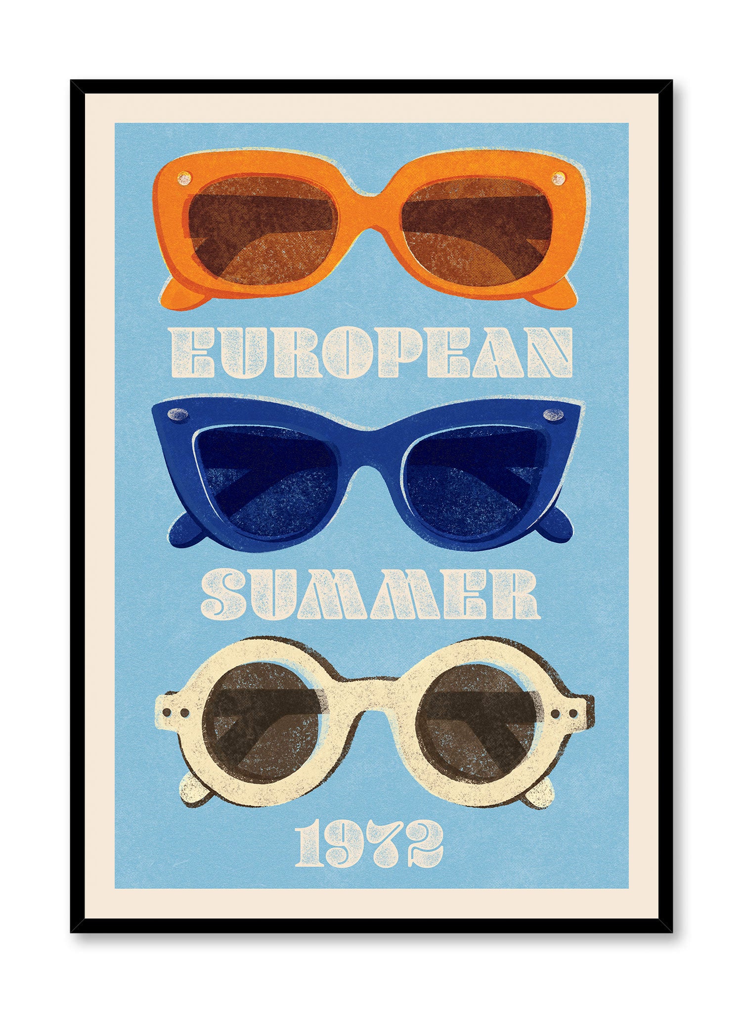 Ce visuel affiche présente un trio de lunettes de soleil élégantes, superposées verticalement sur un fond bleu clair, dans une composition ludique d'inspiration rétro. Le texte en gras et en blocs annonce « Été européen 1972 », évoquant instantanément une ambiance joyeuse et nostalgique des vacances ensoleillées passées. Les lignes épurées et la disposition organisée confèrent à cette pièce un aspect équilibré, à la fois dynamique et artistique.
