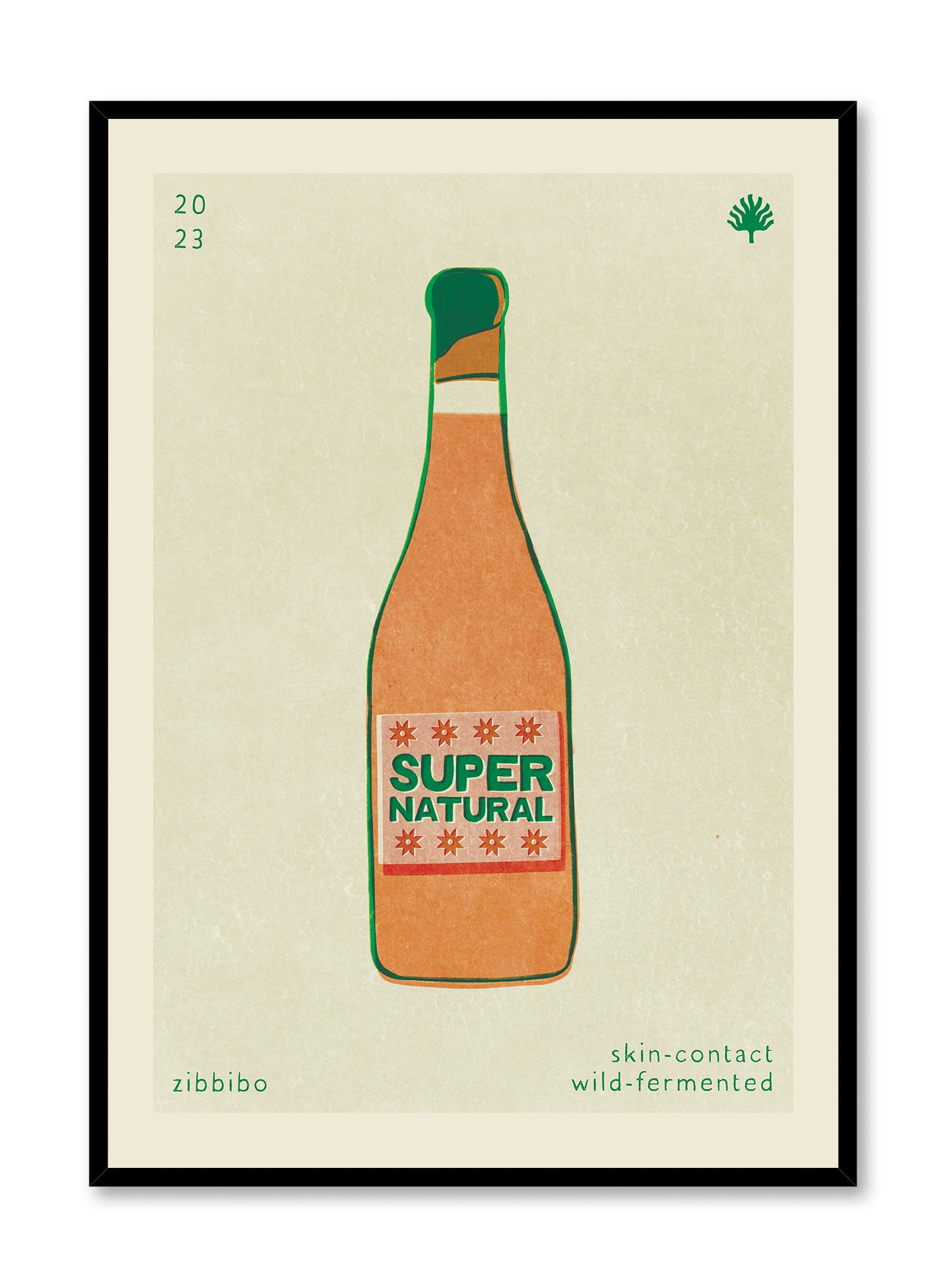 Cette œuvre graphique affiche est un clin d'œil élégant à l'univers du vin naturel. Une bouteille de vin orange illustrée porte l'étiquette « Super Naturel », avec des détails l'identifiant comme « Zibbibo », « de contact avec la peau » et « de fermentation sauvage ». Le design, à la fois pédagogique et artistique, célèbre une approche moderne de la vinification avec une esthétique rétro et ludique.