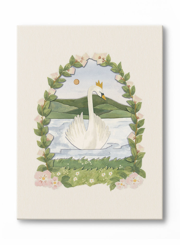 Un cygne serein glisse gracieusement sur un lac paisible, couronné d'un diadème doré qui reflète la douce lumière d'un soleil couchant. Entouré d'une arche luxuriante de feuilles vertes et de délicates fleurs roses, le paysage évoque une élégance paisible. Des collines ondulantes s'étendent au loin, peintes dans de douces teintes de vert et de bleu, créant un décor à la fois intemporel et accueillant.