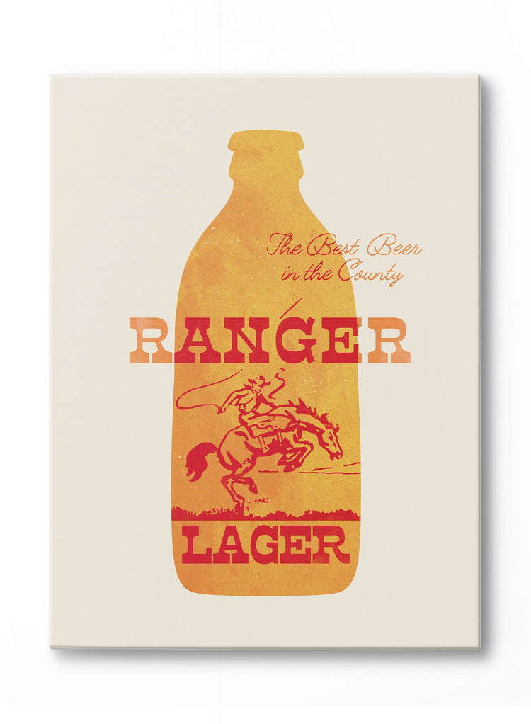 Cette toile au style rétro capture l'esprit aventureux de l'Ouest américain dans la silhouette ambrée d'une bouteille de bière, représentant un cow-boy lassoant habilement à cheval. De riches teintes d'orange coucher de soleil et de rouille profonde, accompagnées d'un lettrage vintage proclamant « La meilleure bière du comté », créent une ambiance rustique et dynamique.