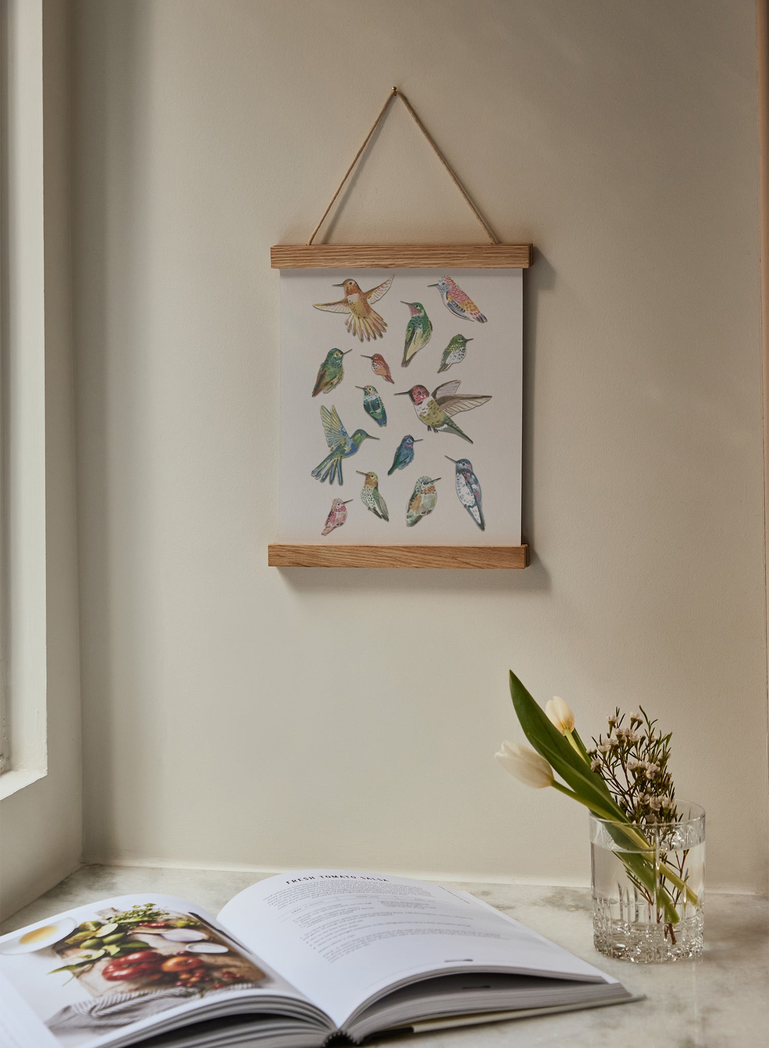 Idéal pour un bureau à domicile ou une chambre sereine, ce affiche apporte une touche de nature à l'intérieur. Associez-le à un cadre en bois simple pour compléter son thème organique, ou choisissez un cadre noir élégant pour un contraste moderne. Ajoutez du linge de maison doux ou un vase en céramique à proximité pour accentuer l'atmosphère paisible. Cette œuvre invite à un moment de pause, l'occasion d'admirer la beauté délicate de ces minuscules merveilles aviaires.