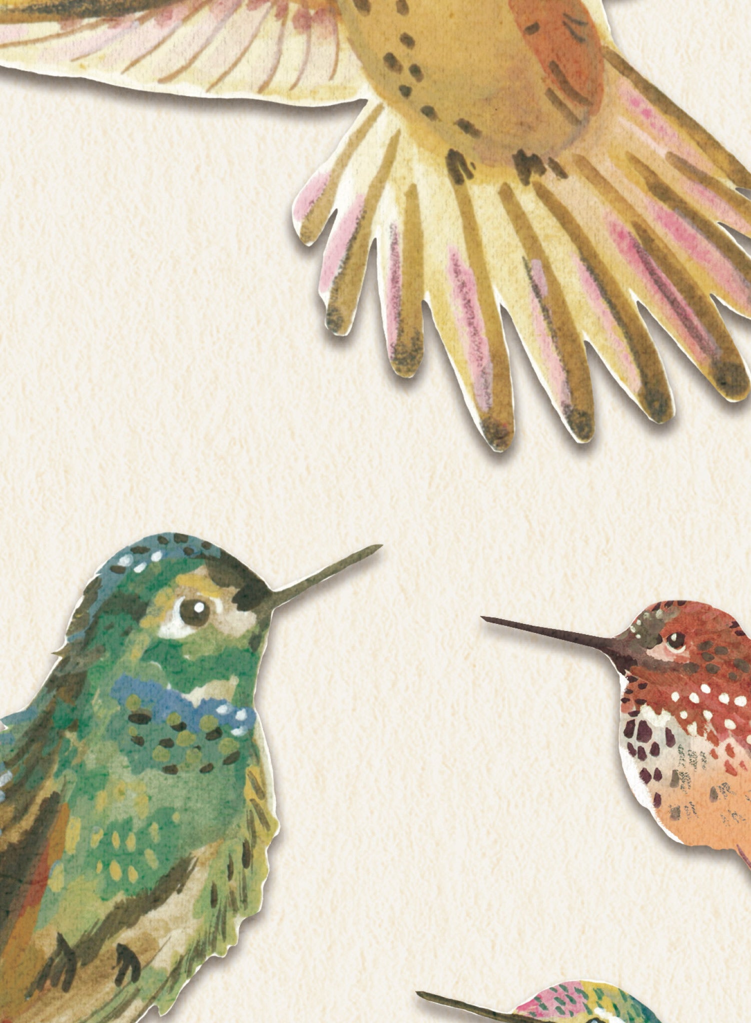Un vibrant rassemblement de colibris orne ce affiche. Chaque oiseau, capturé en plein vol ou posé délicatement, présente un spectre de couleurs allant du vert émeraude au rose tendre en passant par le bleu profond. Les oiseaux se détachent sur un fond crème, laissant leurs motifs complexes et leurs teintes vives occuper le devant de la scène. Chaque plume est minutieusement détaillée, créant une impression de mouvement et de vie qui attire le regard et stimule l'imagination.