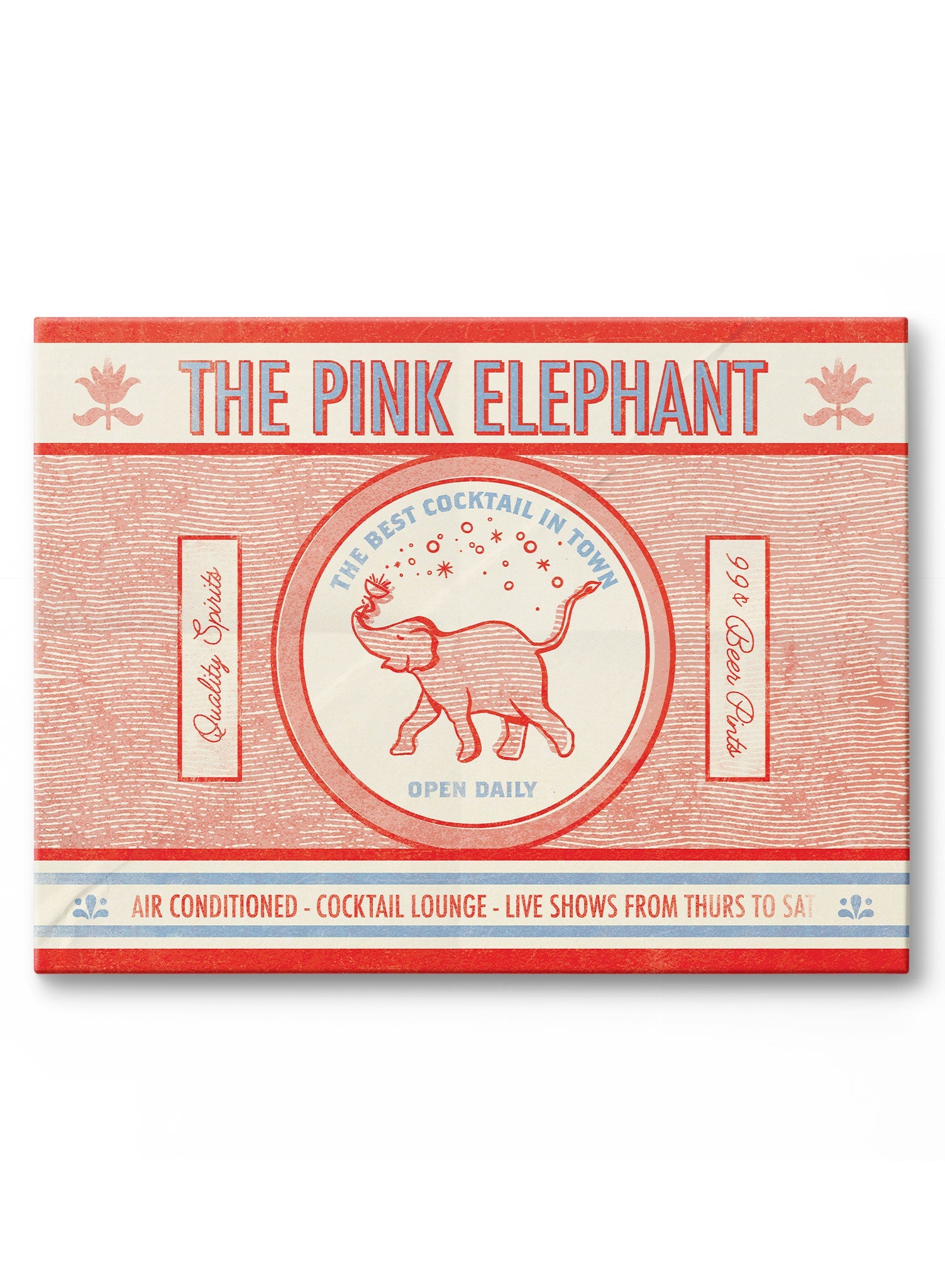 Cette toile est une publicité d'inspiration rétro pour « L’Éléphant Rose », un bar à cocktails fictif. Représentant un éléphant joliment illustré tenant un verre en équilibre sur sa trompe, le motif est orné d'une typographie vintage et de détails classiques comme « Spiritueux de qualité » et « Climatisation ». C'est une œuvre éphémère et fantaisiste qui évoque la culture des bars du milieu du siècle.