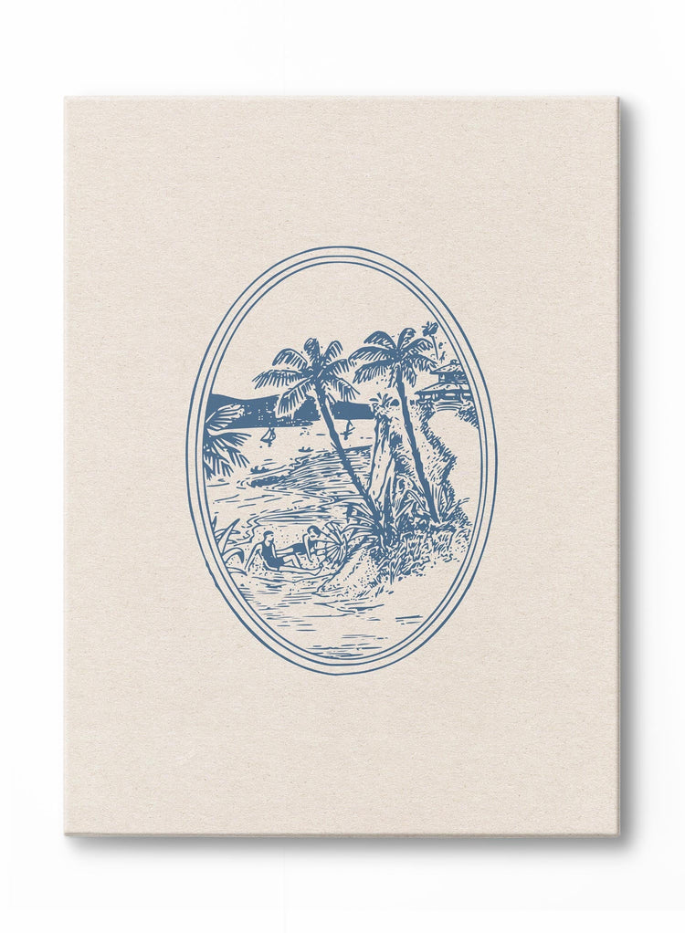 Comme une fenêtre sur un souvenir d'été parfait ! Un cadre ovale contient une œuvre sur toile vintage bleue de palmiers tropicaux et de vagues s'écrasant sur une plage de sable.