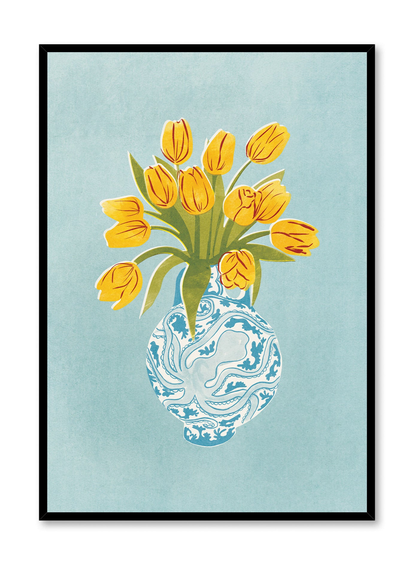 Oubliez le surf et le gazon, nous voulons du surf et des tulipes ! Cette aquarelle représente un bouquet de tulipes jaunes dans un vase arrondi bleu décoré de vagues.