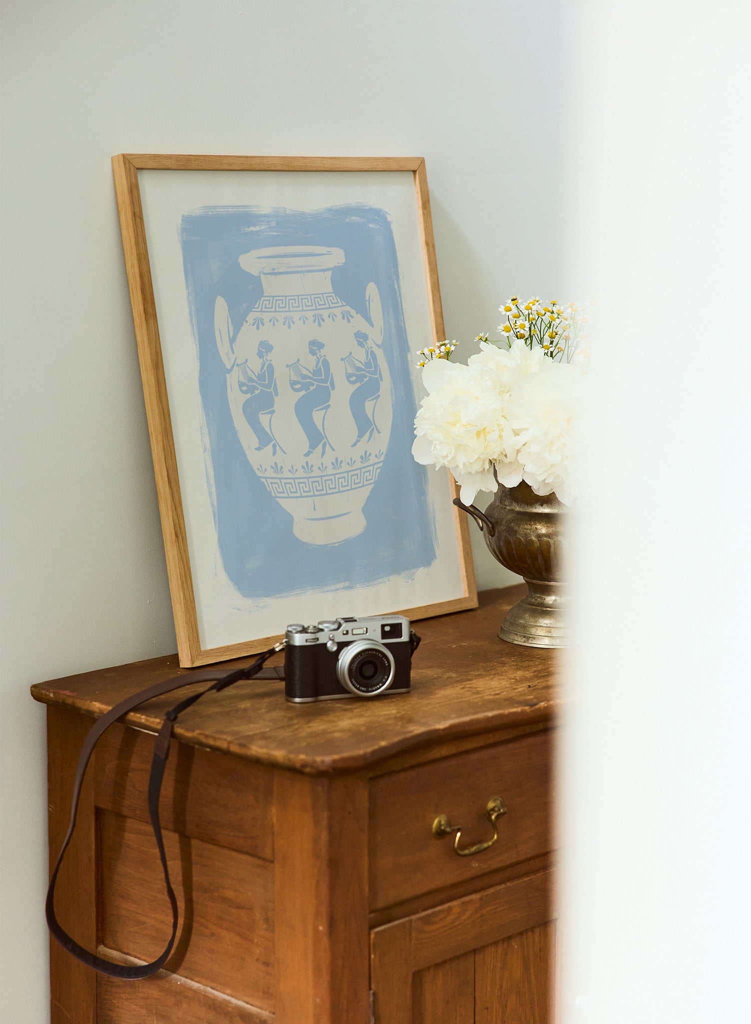 La palette monochrome et apaisante de l'illustration, composée de bleu doux et de blanc cassé crémeux, crée une atmosphère paisible et raffinée. Le fond peint au pinceau offre un joli contraste texturé avec les lignes épurées et graphiques des personnages et du vase lui-même. Ce jeu d'éléments doux et précis confère à cette pièce une touche de fraîcheur et de modernité tout en respectant son inspiration classique.