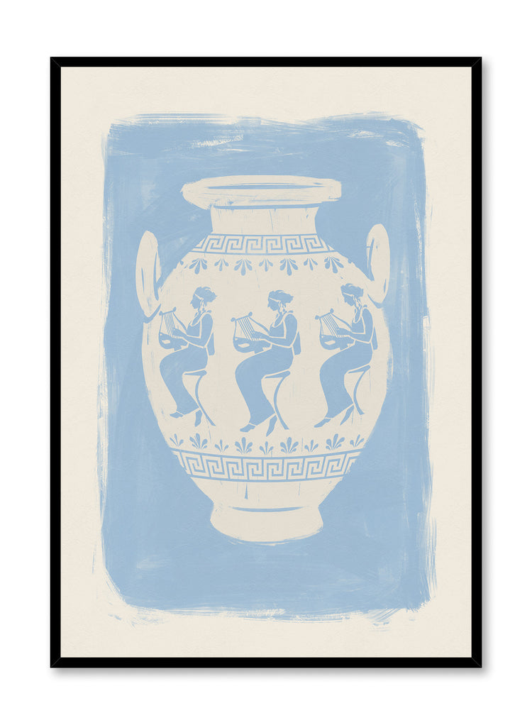 Cet élégant affiche représente une amphore grecque classique, décorée d'une scène de personnages gracieux jouant de la lyre. La composition rend hommage à l'art antique, capturant un instant de beauté sereine et musicale. Le motif emblématique de la clé grecque borde le haut et le bas du vase, renforçant son authenticité et sa sensibilité classique. Cette pièce sophistiquée évoque l'histoire, la mythologie et l'art méditerranéens.
