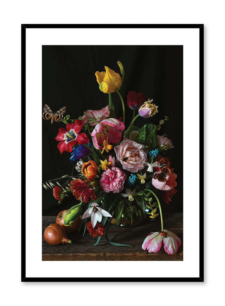 Comme le printemps en mode sombre ! Cette photographie florale est composée de fleurs multicolores sur fond noir.