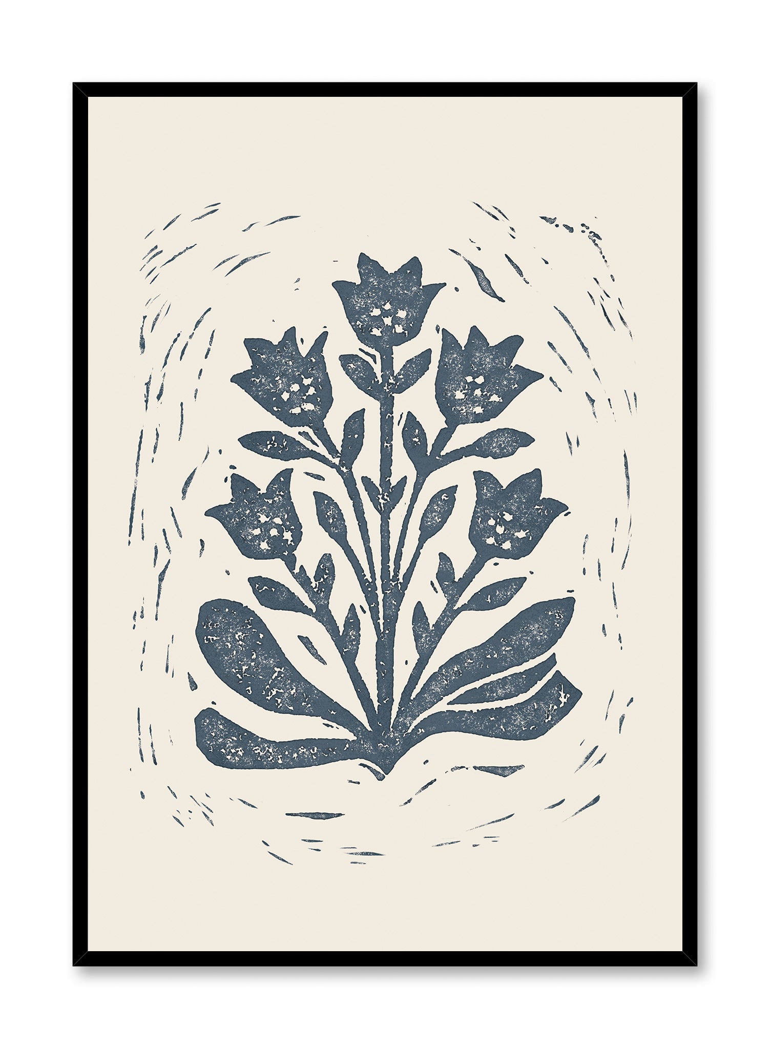 Ce affiche présente un motif floral stylisé, avec des formes audacieuses et simplifiées de fleurs et de feuilles épanouies. Le motif est réalisé dans un bleu monochrome sur un fond doux et neutre, créant un contraste saisissant. Les fleurs sont disposées symétriquement, créant un sentiment d'équilibre et d'harmonie, tandis que les lignes texturées qui les entourent ajoutent une touche dynamique.