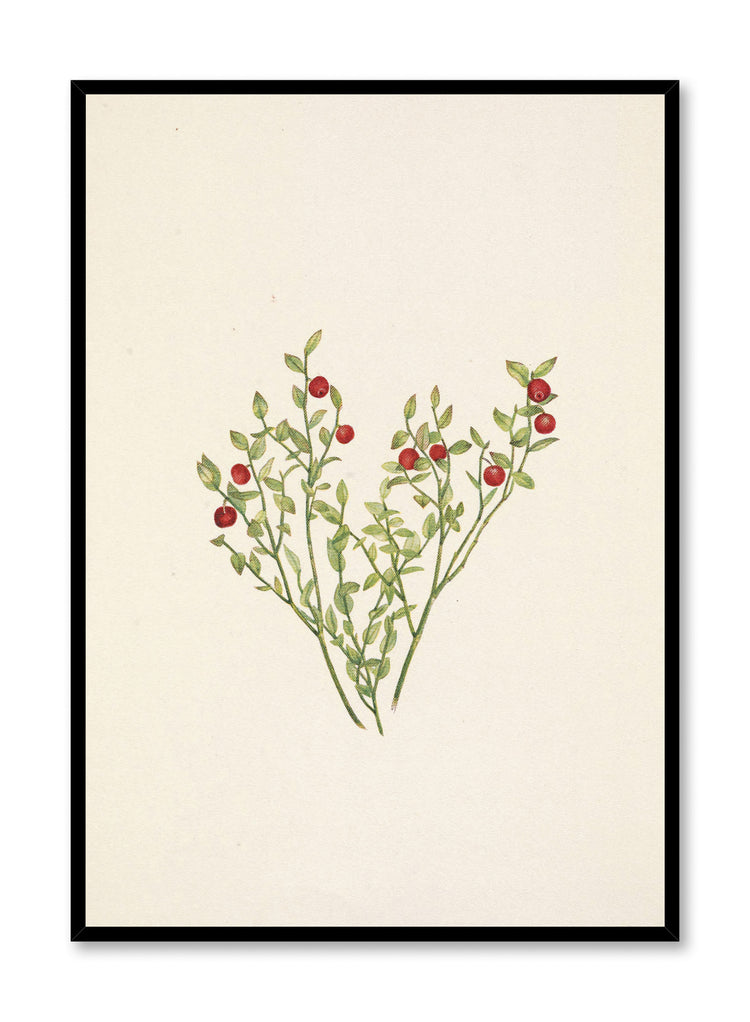 Cette affiche botanique simple et élégante représente une branche de canneberge avec de petites baies rouges et des feuilles vertes claires. Les détails délicats de la plante sont soigneusement dessinés, tandis que le fond neutre permet aux couleurs de ressortir. Le contraste subtil entre le rouge et le vert confère à l'œuvre une qualité à la fois vivante et apaisante.