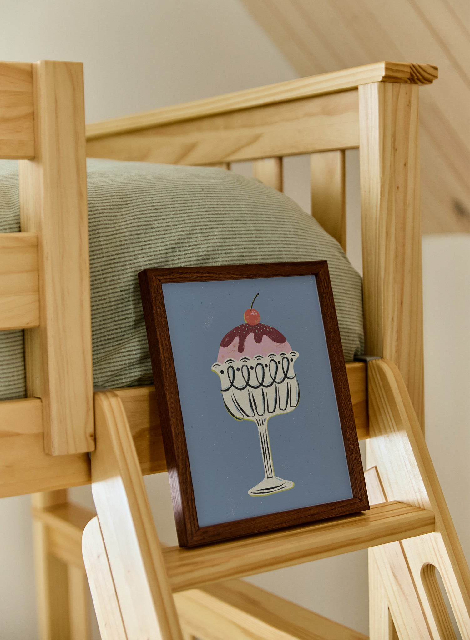 Une boule de glace rose fond doucement sous le fudge chaud dans ce portrait de dessert de style vintage réalisé par Kenzie Elston. Servie dans un plat à crème sur pied avec des détails graphiques noirs, cette pièce se situe à la frontière entre friandise sucrée et objet de collection.