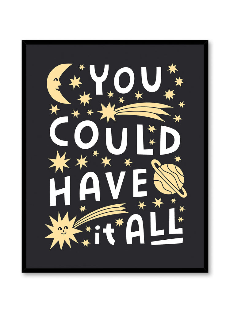 Avec un clin d'œil céleste et un sourire cosmique, cette audacieuse affiche typographique envoie un message directement des étoiles. Des lettres dessinées à la main dansent sur un fond noir profond, entourées d'étoiles filantes dorées, d'un soleil joyeux et d'une lune en croissant qui semble murmurer des possibilités. Un clin d'œil vintage à la divination et à l'optimisme céleste, cette pièce invite à de grands rêves et à un potentiel illimité.
