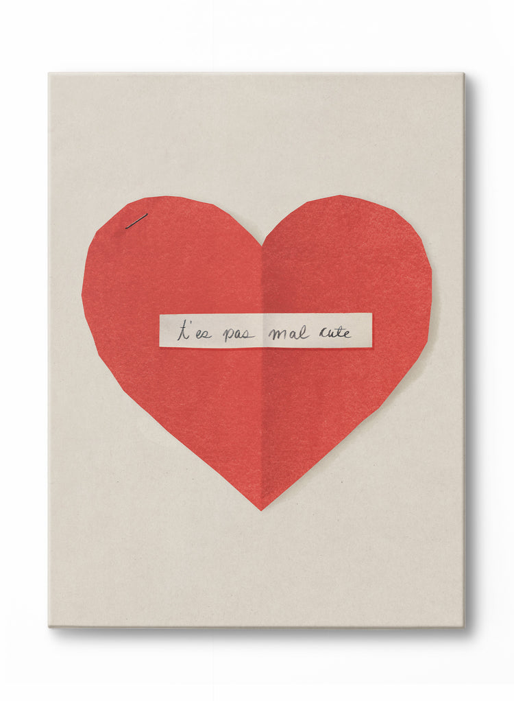 Cette œuvre sur toile charmante allie fantaisie et affection avec un cœur rouge à texture de papier, arborant la note manuscrite « T’es pas mal cute », qui se traduit par « T’es vraiment cute ». Le message simple et sincère est à la fois ludique et attachant, évoquant la nostalgie des petits mots échangés et des douces confessions.