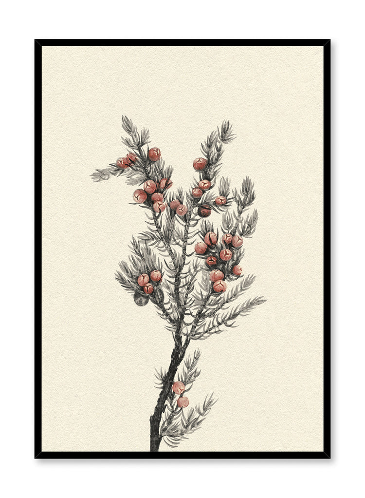 Cozy up and enjoy 'A Winter's Tale' : a beautiful illustration of a dark evergreen tree branch decorated with brown acorns over a beige background. This cozy poster will keep your wall warm during winter!