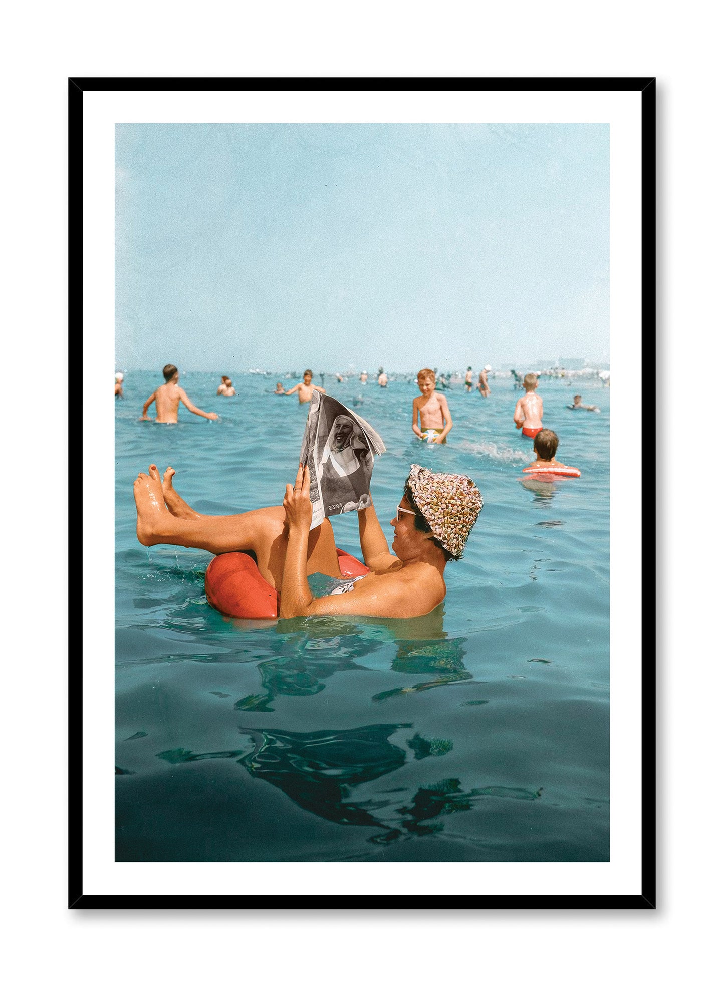 Our studio’s meticulous hand-colouring process gives this vintage scene a vibrant, contemporary pulse. The rich, ruby red of the inner tube creates a brilliant focal point against the deep, inviting blue of the water, while the spots of the swim cap add a dash of graphic flair. The colouring sharpens the details, from the crinkle of the newspaper to the gentle waves, making this candid moment feel like a scene from a beloved European film.