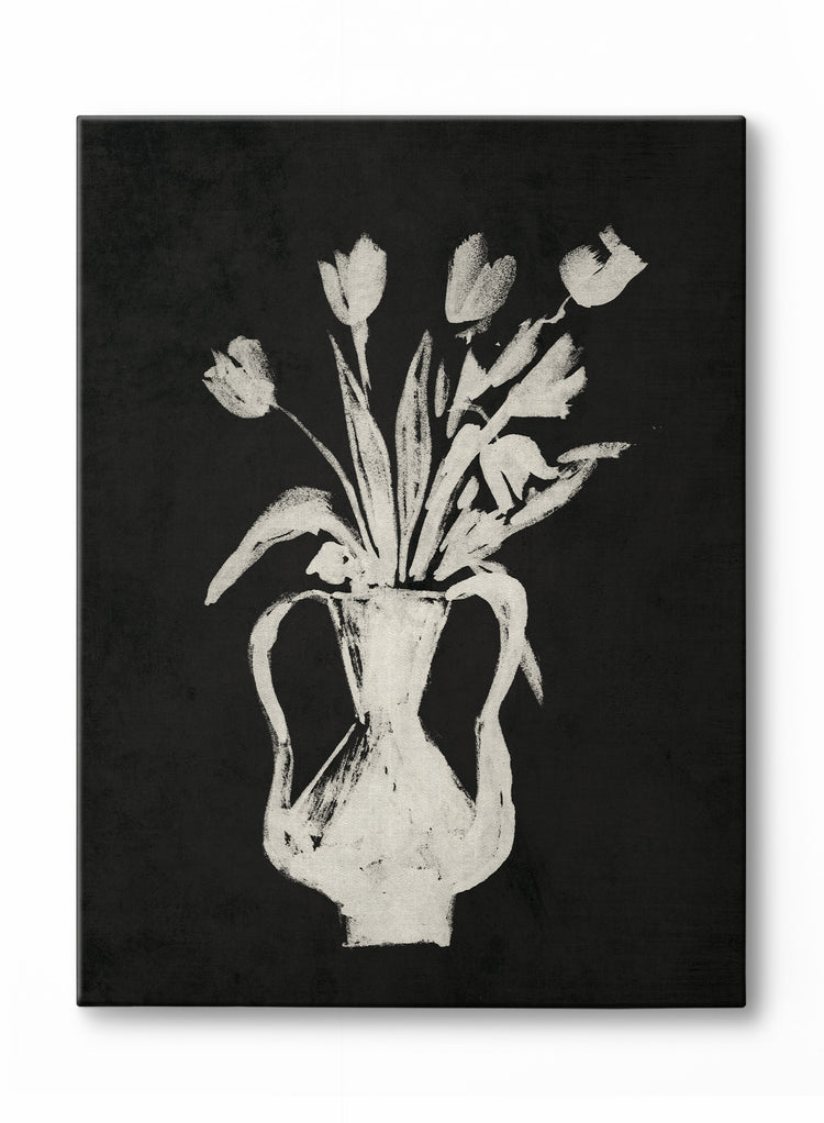 This elegant, monochromatic still life features a vase of stylized flowers, rendered in soft, muted shades of cream and black.